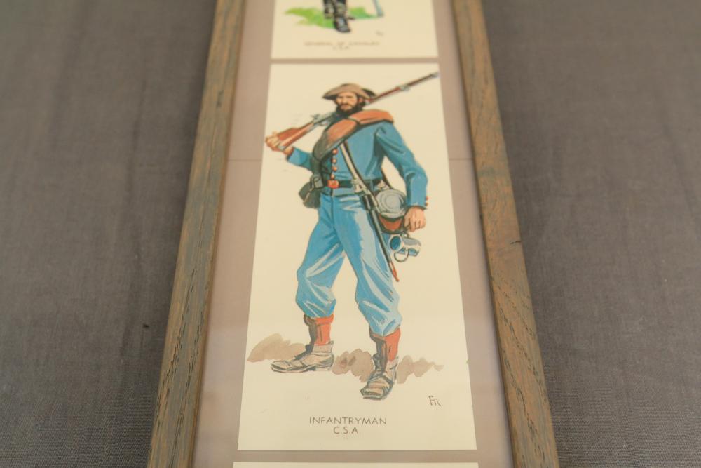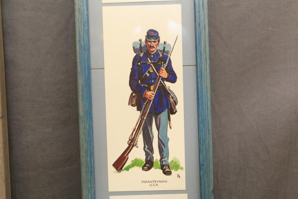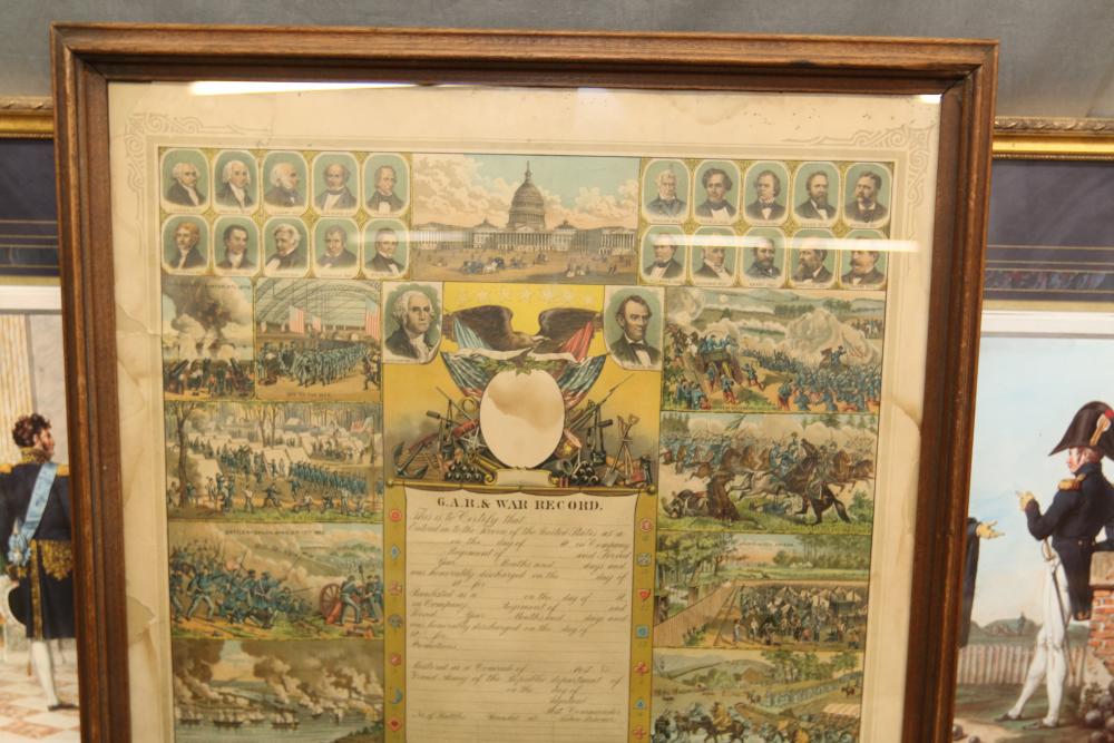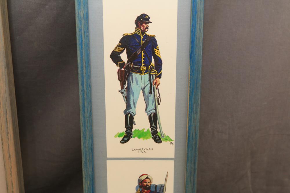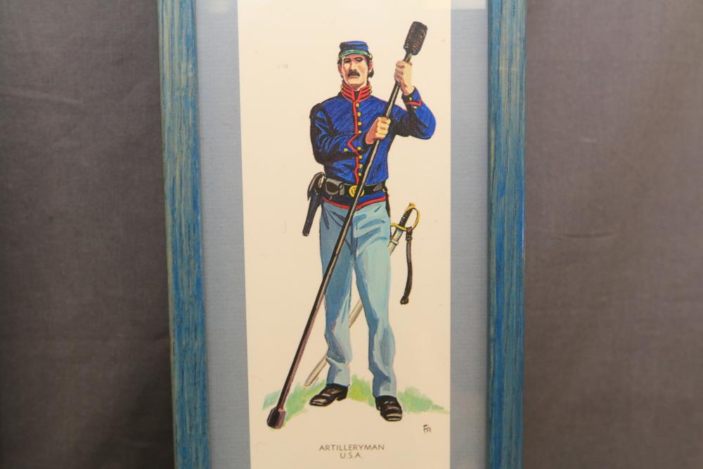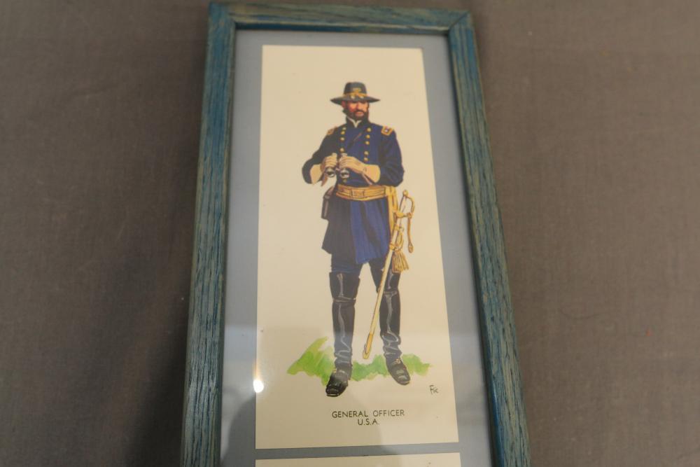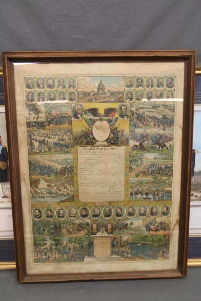 Framed artwork incl two prints titled "Officers Generaux" and "Artilleurs", print of post battle scene with officers on horses and people wearing red coats, "G.A.R. & War Record" marked on lower left "Entered According to Act of Congress in the Year 1888 by J.M. Vickroy, In the Office of the Librarian of Congress at Washington D.C." marked lower right "Published by J. M. Vickroy & Co Terre Haute, Indiana", Frederick Remington military personnel prints incl "Federal Zouave U.S.A.", "Calvaryman U.S.A.", "Artilleryman U.S.A.", "Infantry Officer U.S.A.", "Infantryman U.S.A.", "Drummer U.S.A.", "General Officer U.S.A.", "Confederate Zouave C.S.A.", "Calvaryman C.S.A.", "Artilleryman C.S.A.", "Infantry Officer C.S.A.", "Infantryman C.S.A.", "General of Cavalry C.S.A.", and "General Officer C.S.A." all marked lower right "FR", two being 6" x 61", largest being 23.5" x 30.5".
