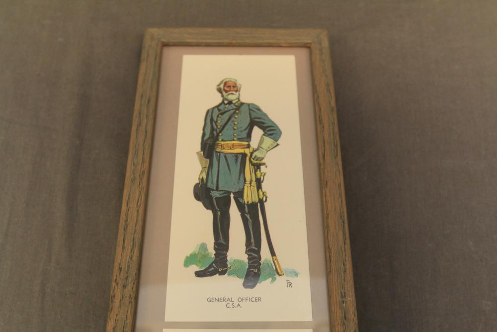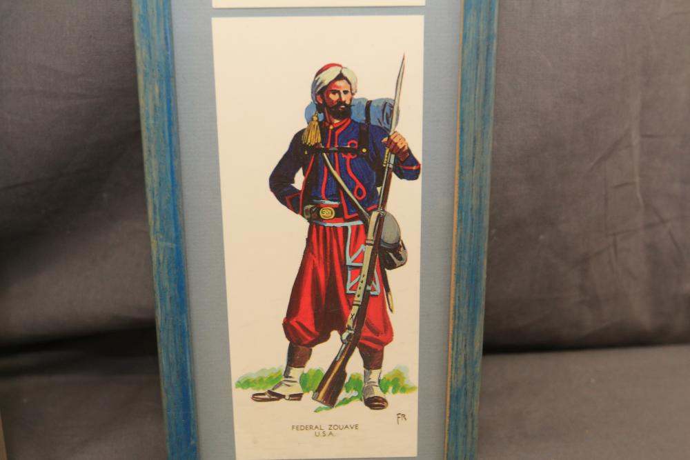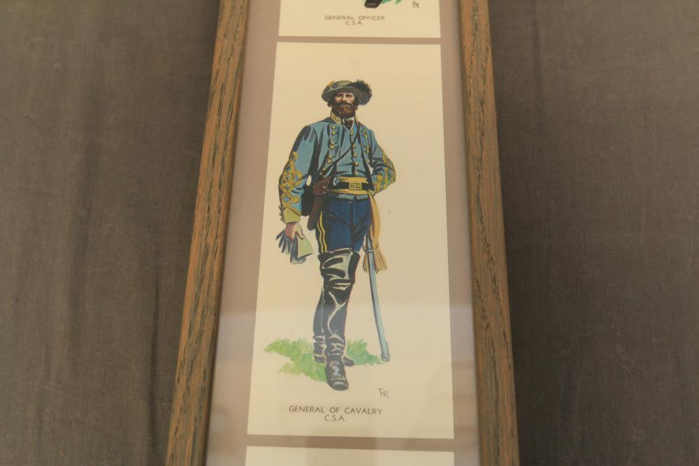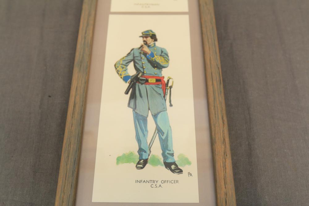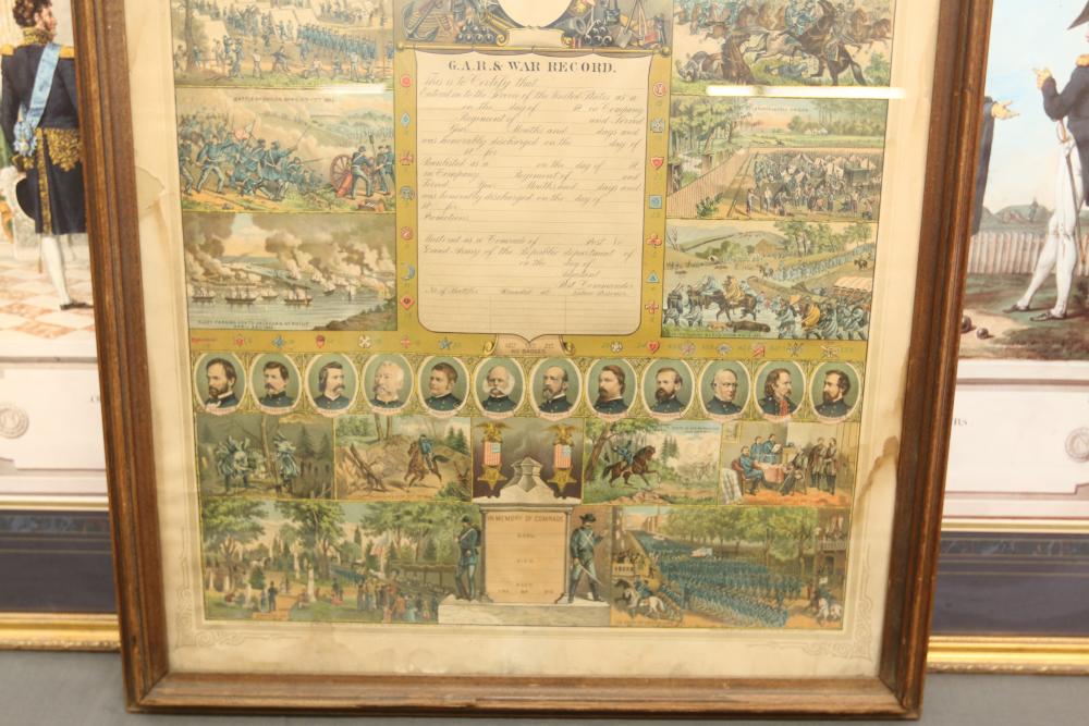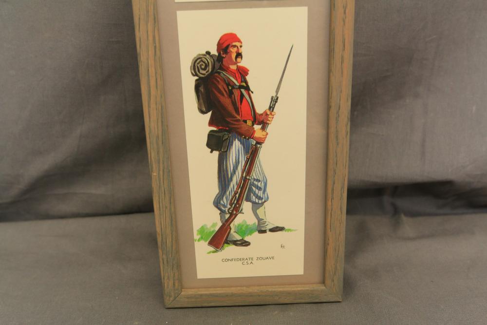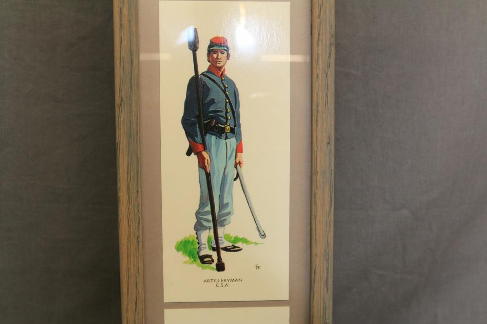 Framed artwork incl two prints titled "Officers Generaux" and "Artilleurs", print of post battle scene with officers on horses and people wearing red coats, "G.A.R. & War Record" marked on lower left "Entered According to Act of Congress in the Year 1888 by J.M. Vickroy, In the Office of the Librarian of Congress at Washington D.C." marked lower right "Published by J. M. Vickroy & Co Terre Haute, Indiana", Frederick Remington military personnel prints incl "Federal Zouave U.S.A.", "Calvaryman U.S.A.", "Artilleryman U.S.A.", "Infantry Officer U.S.A.", "Infantryman U.S.A.", "Drummer U.S.A.", "General Officer U.S.A.", "Confederate Zouave C.S.A.", "Calvaryman C.S.A.", "Artilleryman C.S.A.", "Infantry Officer C.S.A.", "Infantryman C.S.A.", "General of Cavalry C.S.A.", and "General Officer C.S.A." all marked lower right "FR", two being 6" x 61", largest being 23.5" x 30.5".
