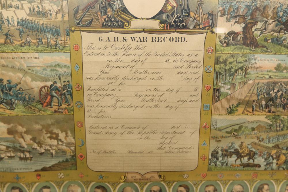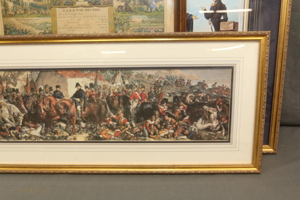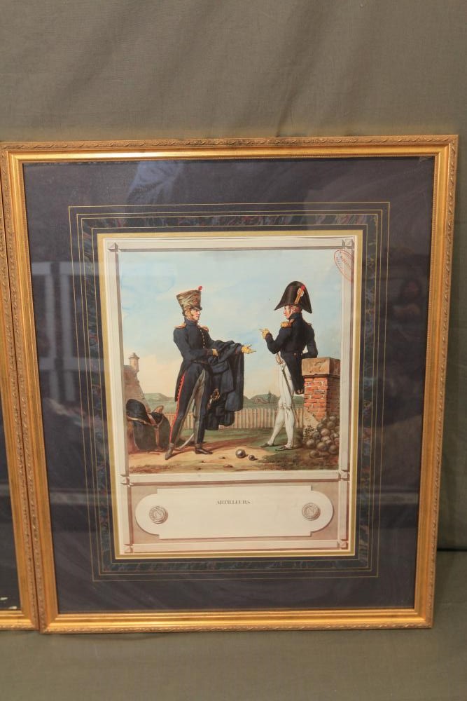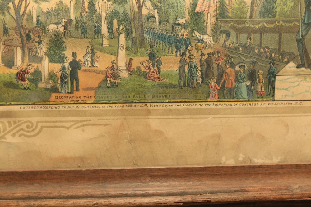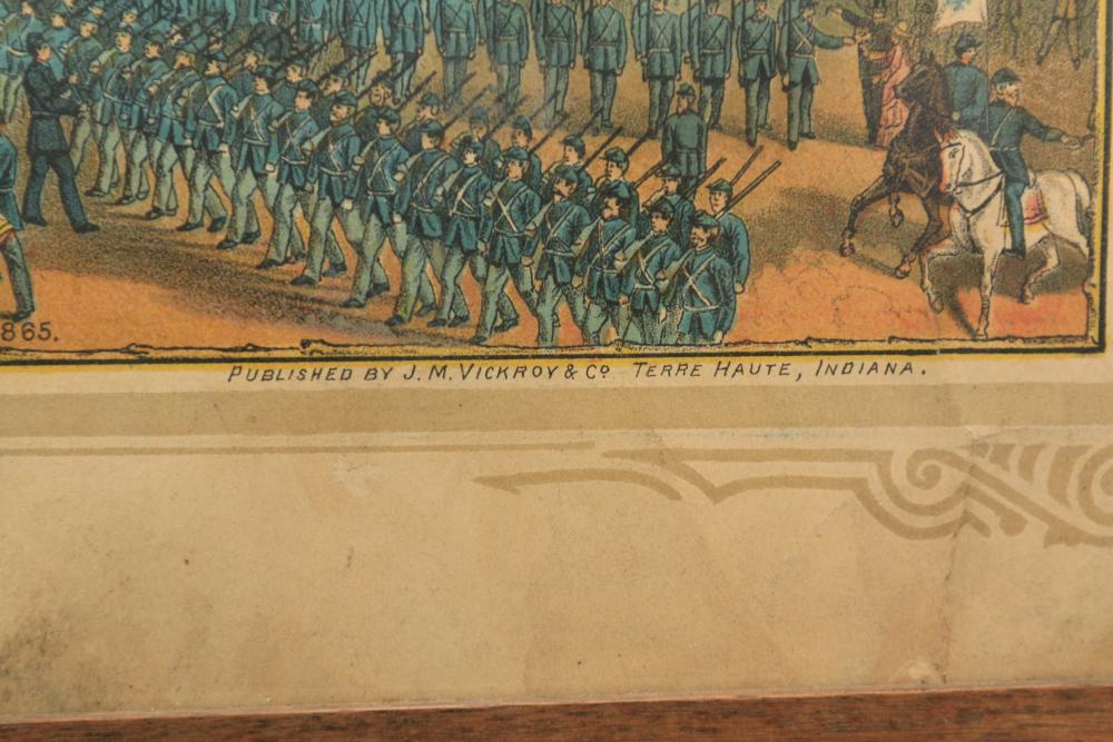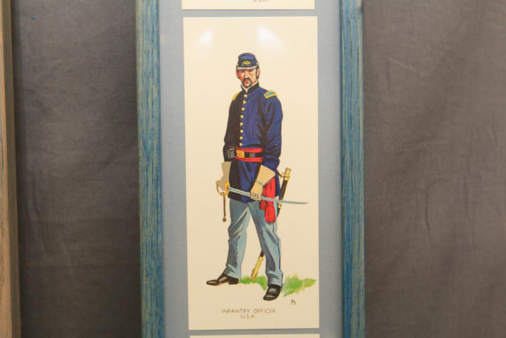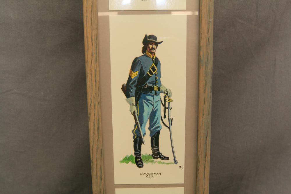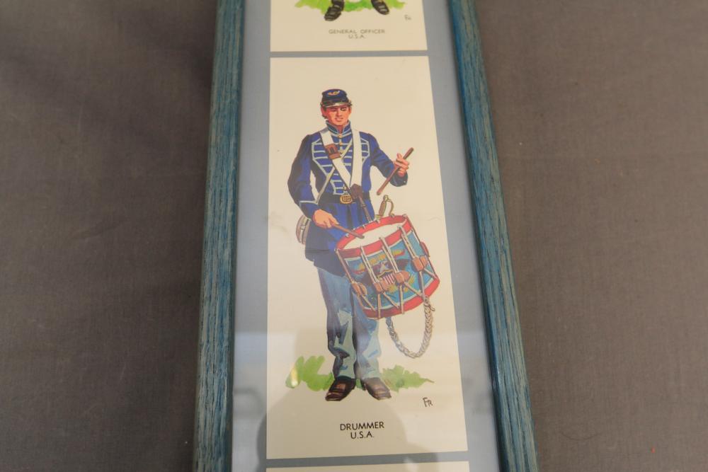 Framed artwork incl two prints titled "Officers Generaux" and "Artilleurs", print of post battle scene with officers on horses and people wearing red coats, "G.A.R. & War Record" marked on lower left "Entered According to Act of Congress in the Year 1888 by J.M. Vickroy, In the Office of the Librarian of Congress at Washington D.C." marked lower right "Published by J. M. Vickroy & Co Terre Haute, Indiana", Frederick Remington military personnel prints incl "Federal Zouave U.S.A.", "Calvaryman U.S.A.", "Artilleryman U.S.A.", "Infantry Officer U.S.A.", "Infantryman U.S.A.", "Drummer U.S.A.", "General Officer U.S.A.", "Confederate Zouave C.S.A.", "Calvaryman C.S.A.", "Artilleryman C.S.A.", "Infantry Officer C.S.A.", "Infantryman C.S.A.", "General of Cavalry C.S.A.", and "General Officer C.S.A." all marked lower right "FR", two being 6" x 61", largest being 23.5" x 30.5".