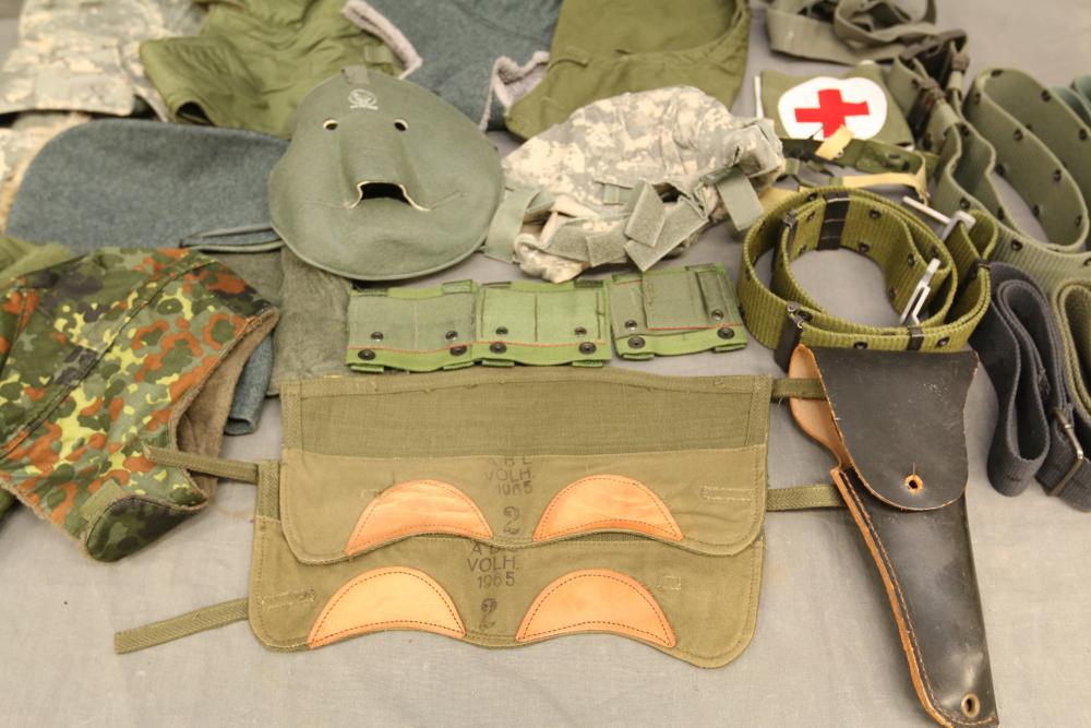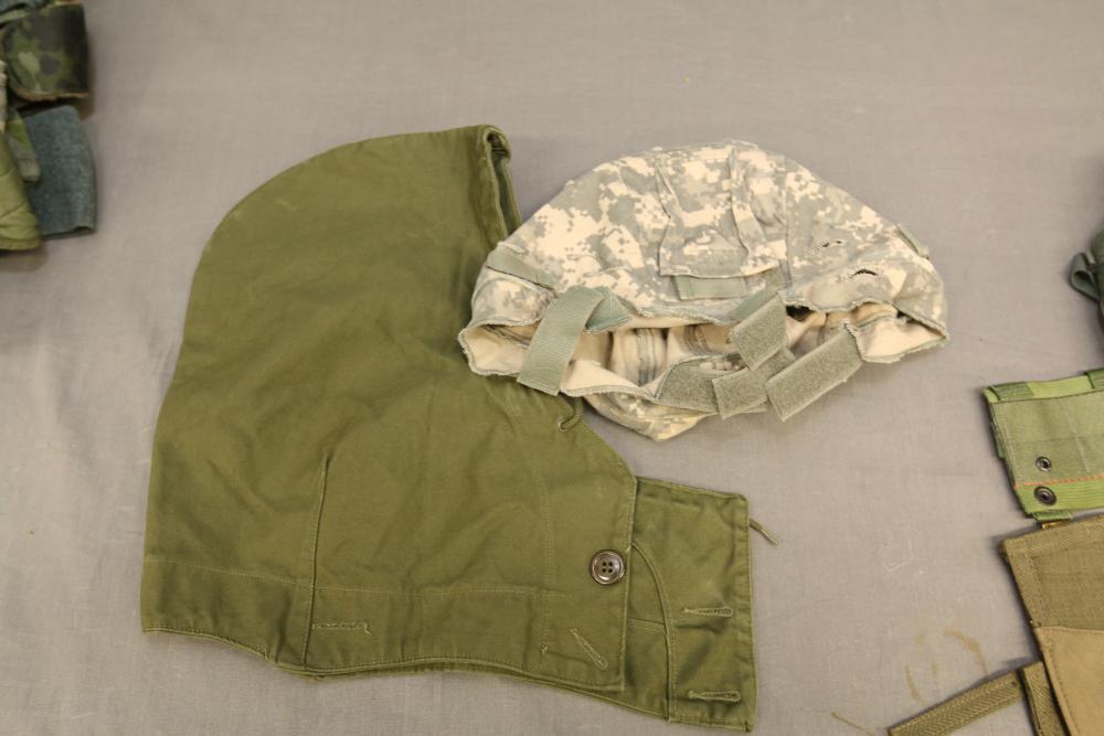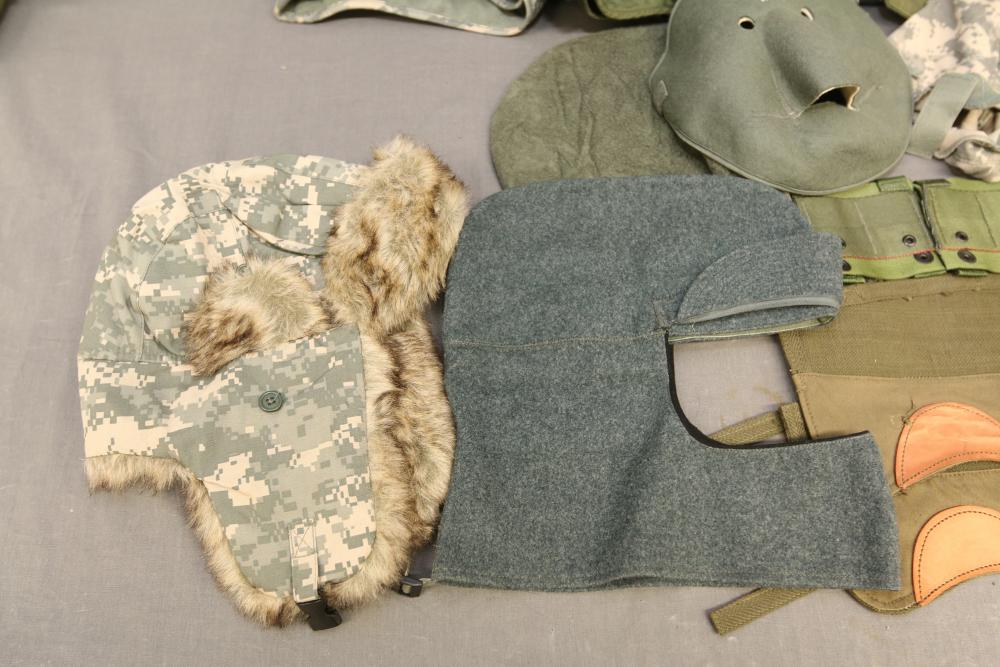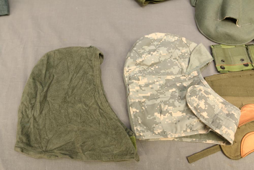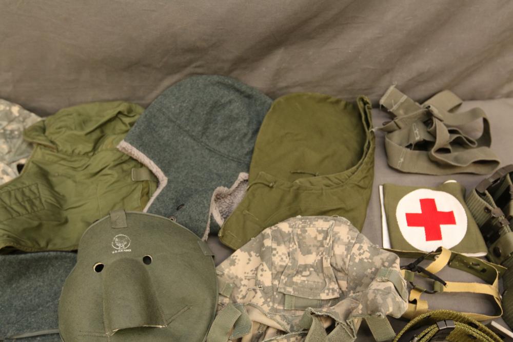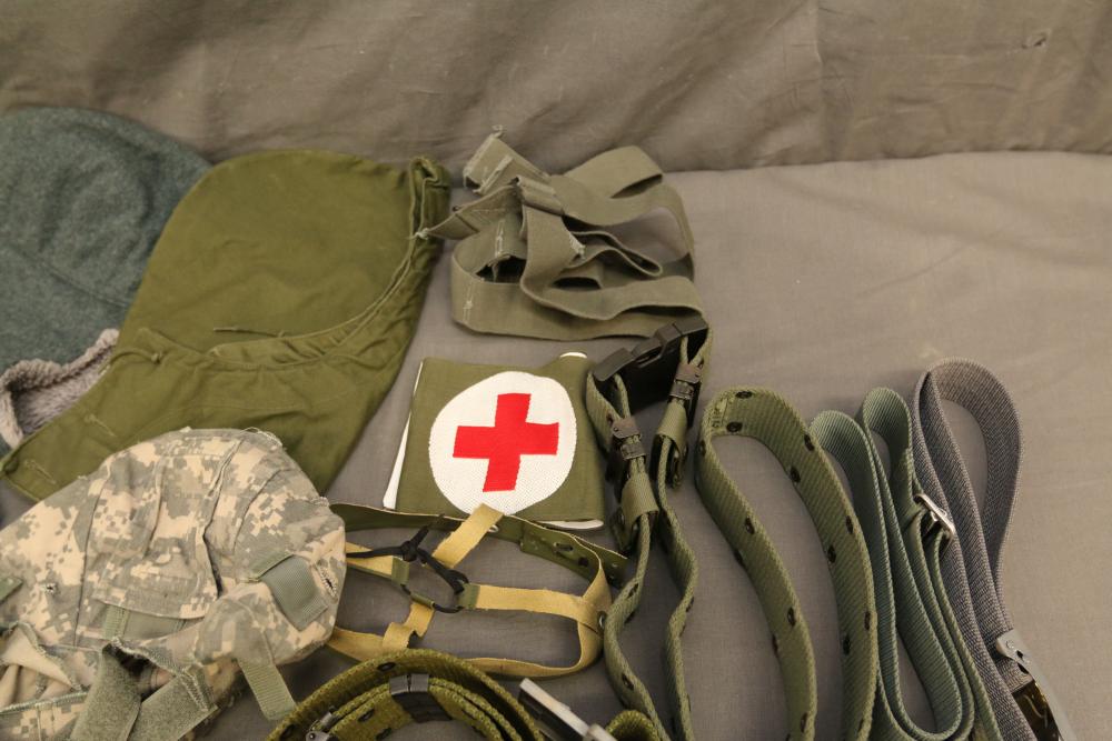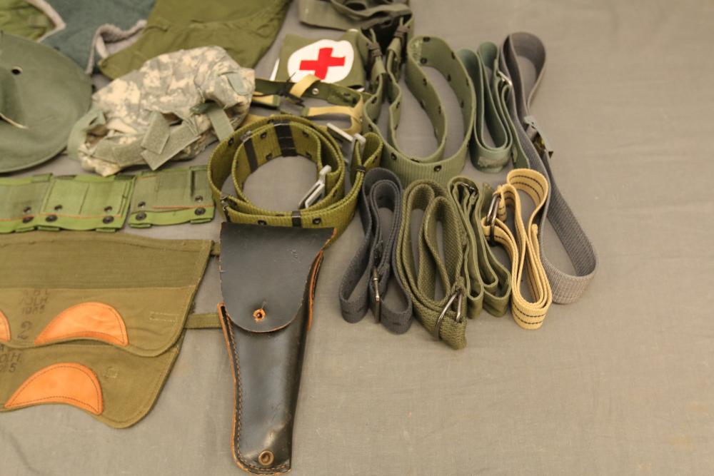 Military hats, belts and accessories incl holster, medical red cross slip on sleeve, digital camo hats, etc.