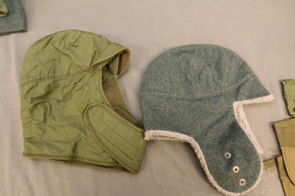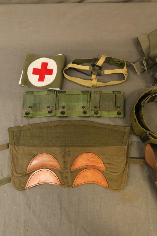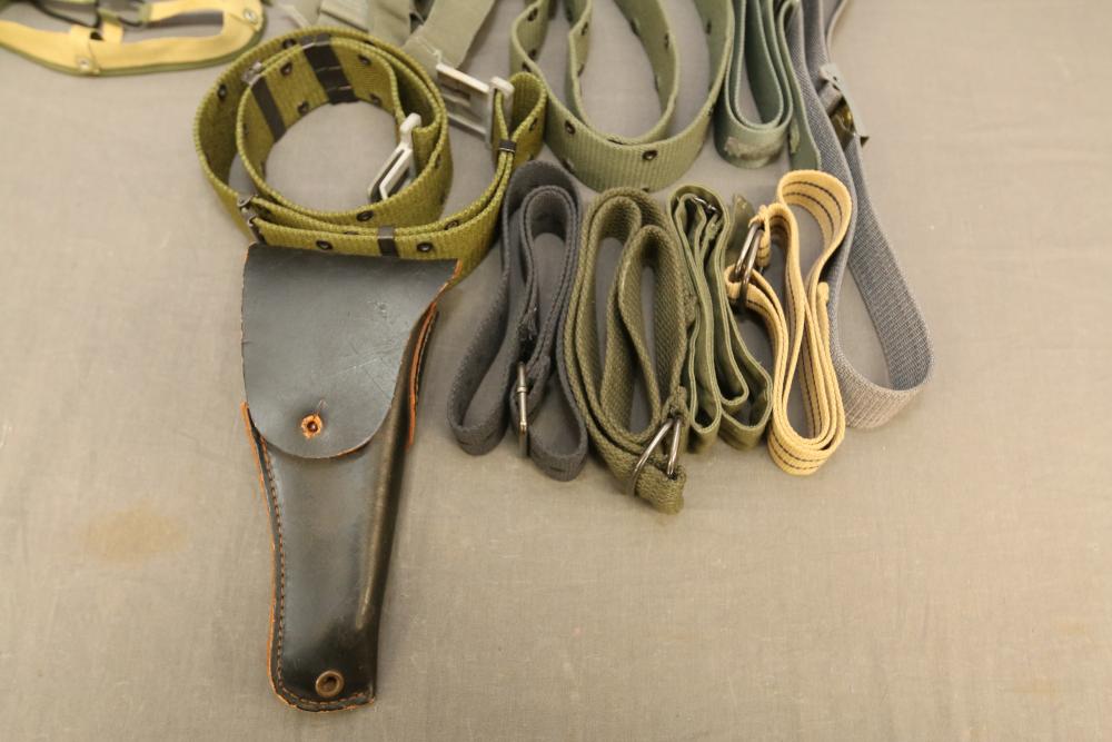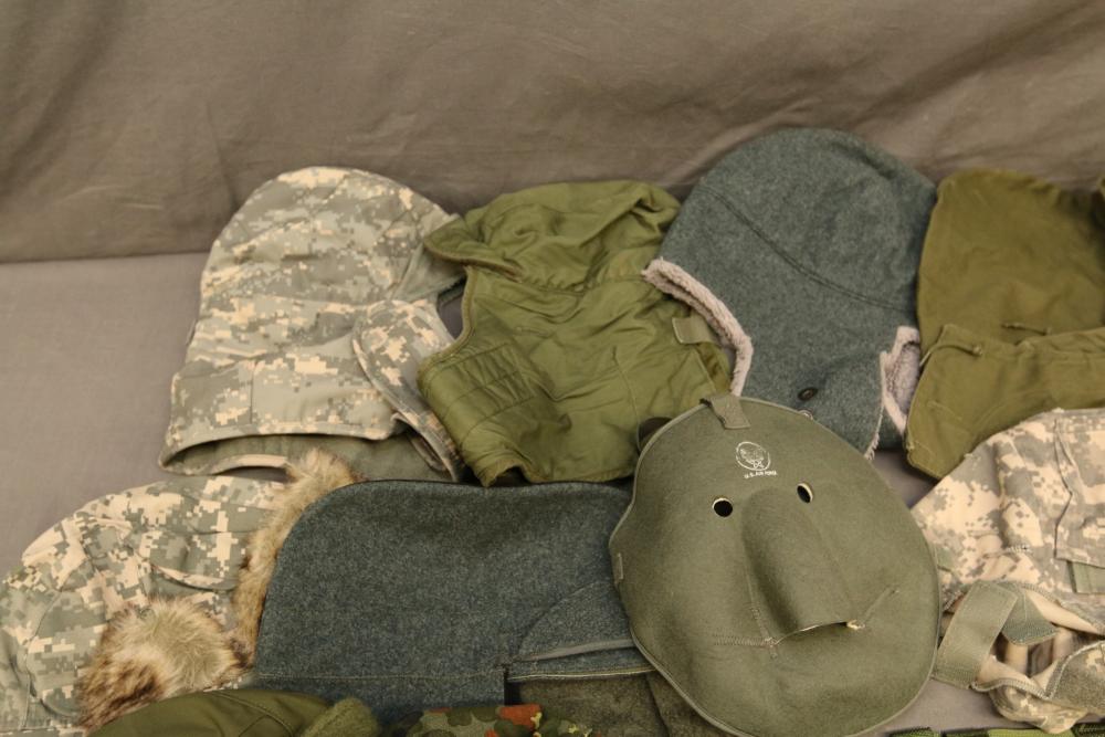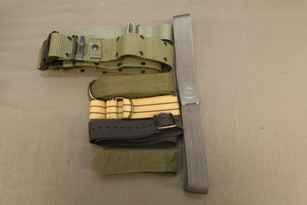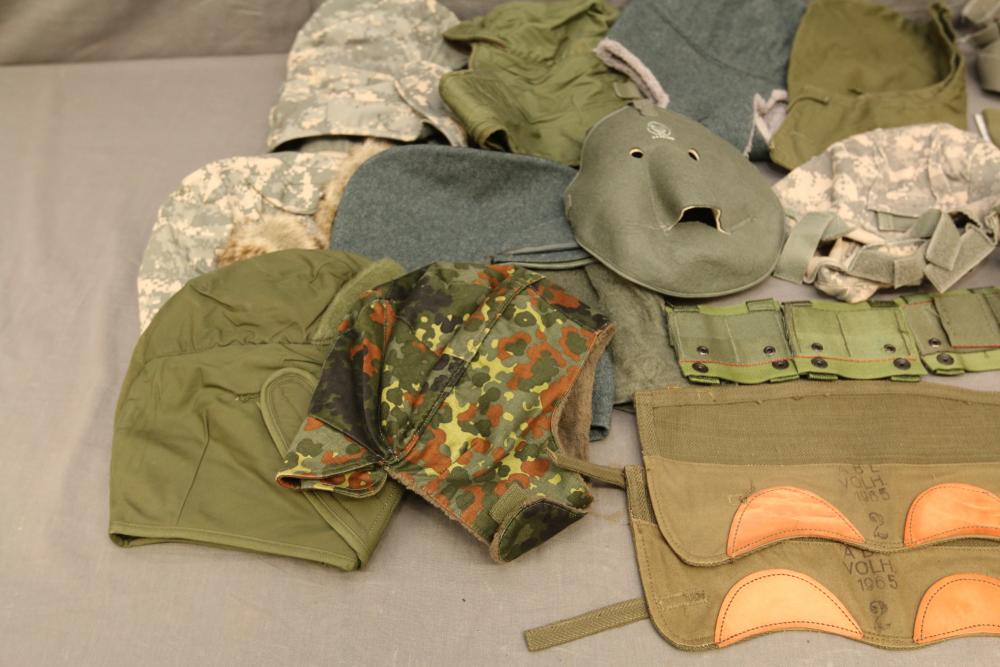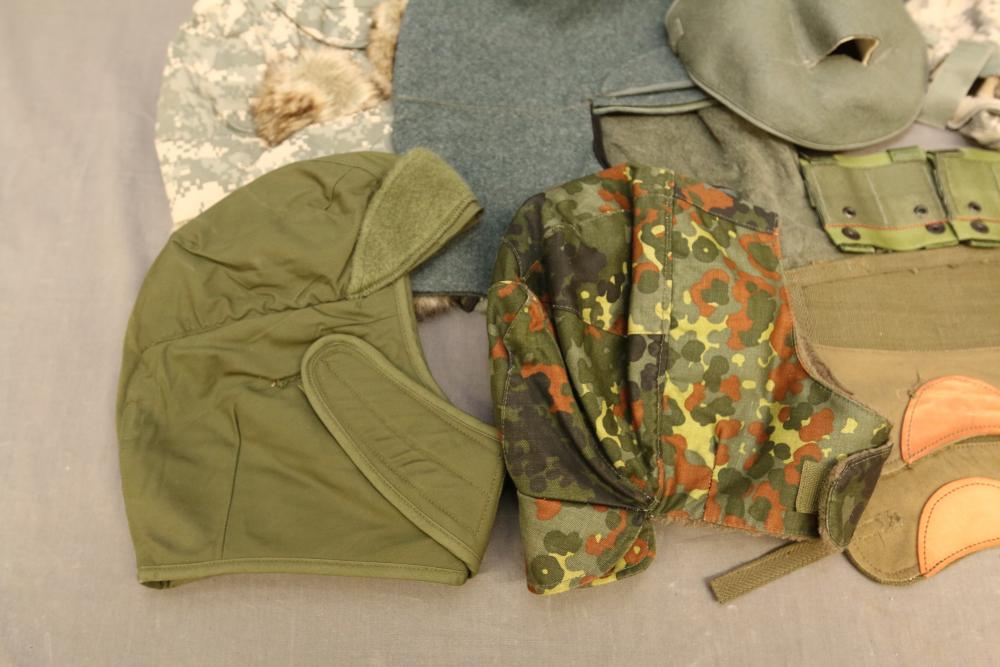 Military hats, belts and accessories incl holster, medical red cross slip on sleeve, digital camo hats, etc.