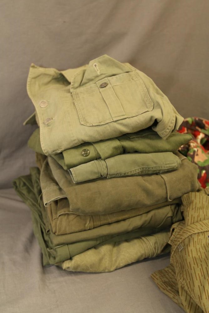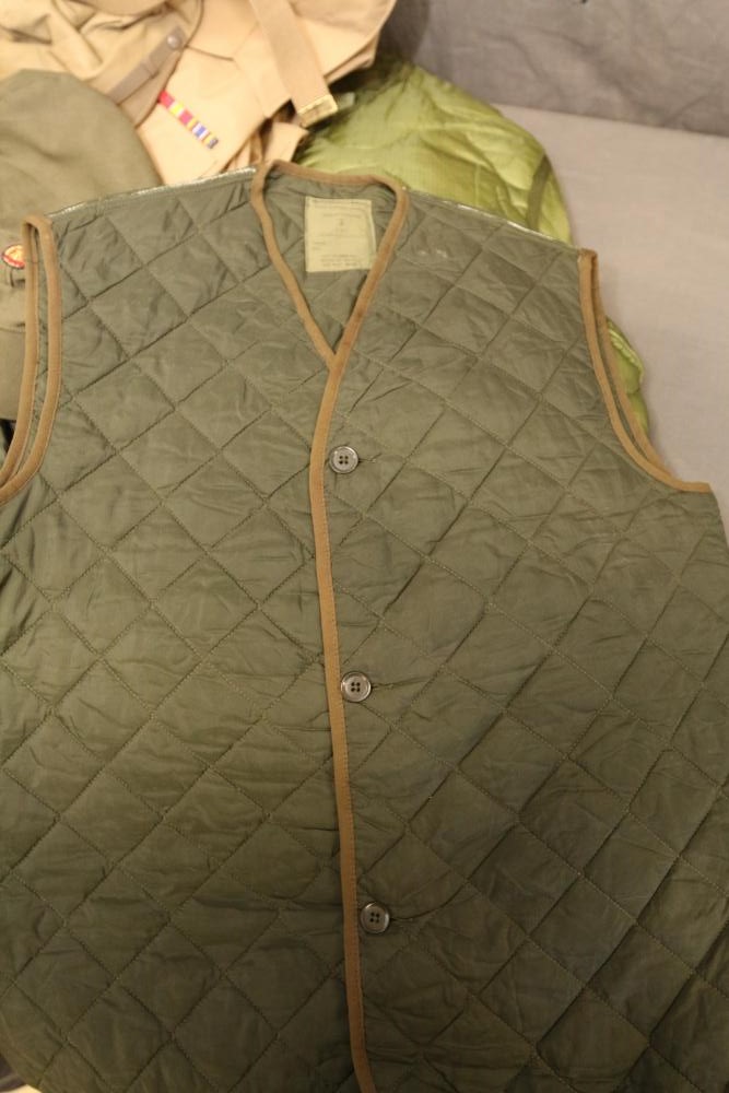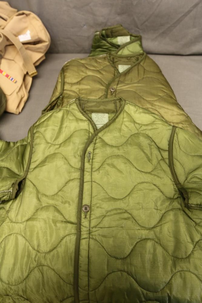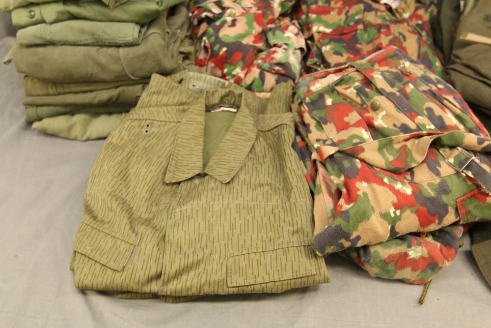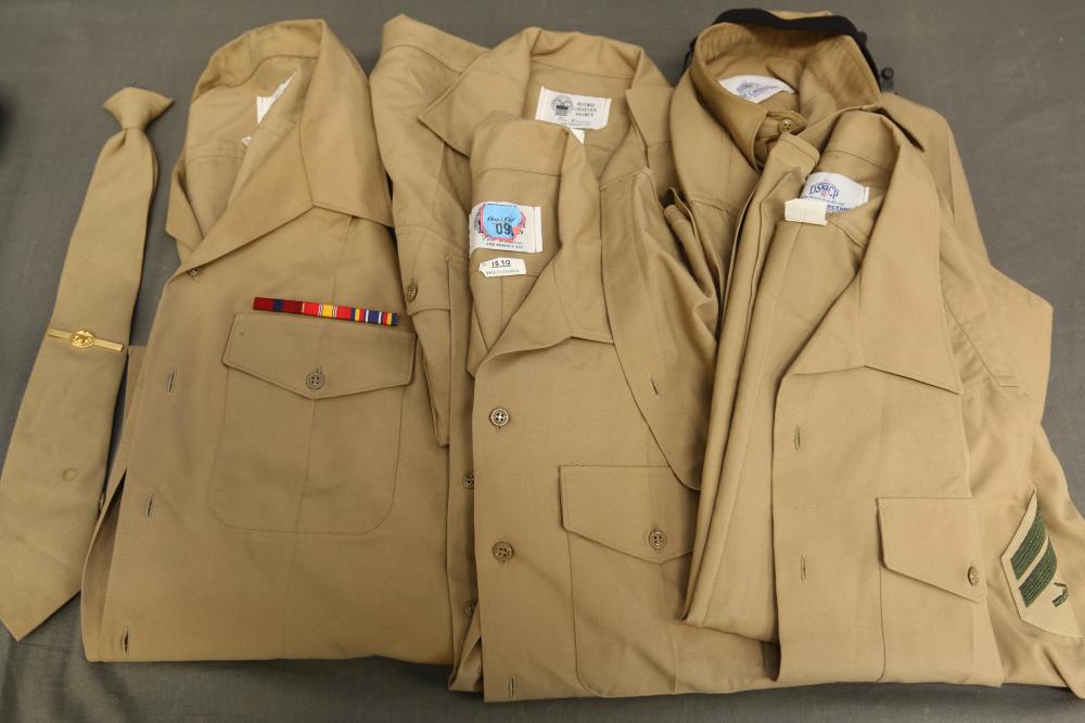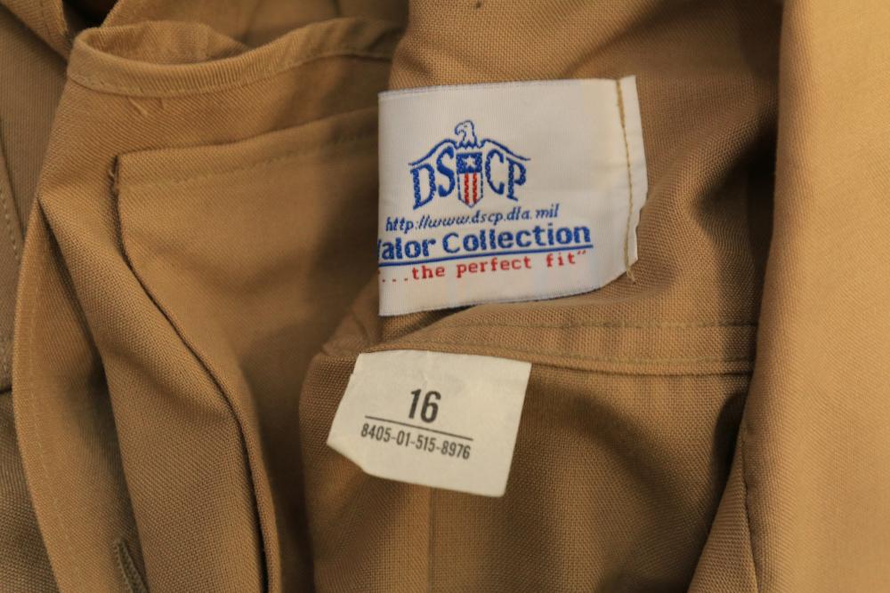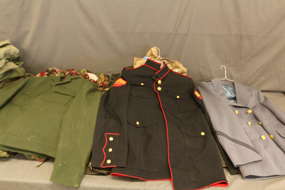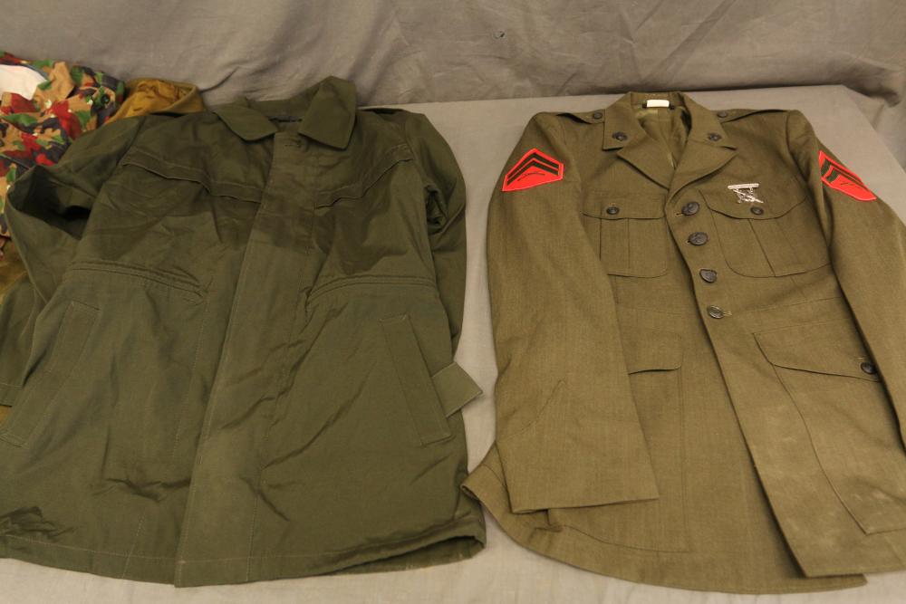 Military clothing incl USMC dress jacket, US Army cadet jacket, three medium down jackets, five tan button down shirts neck sizes 15 1/2 and 16, two having USMC corporal patches, pants sizes 34R and 35XL, USMC jacket having corporal patches "Rifle Expert" pin size 42R, Leibermuster camouflage jackets and overalls, rain pattern camouflage jackets and pants, etc.