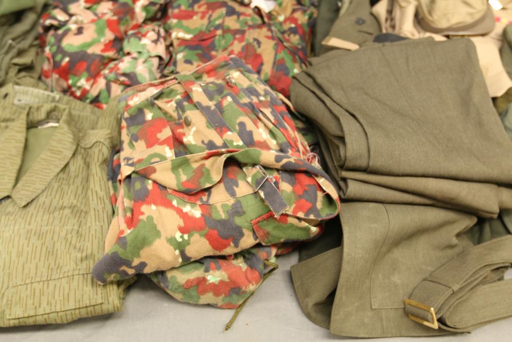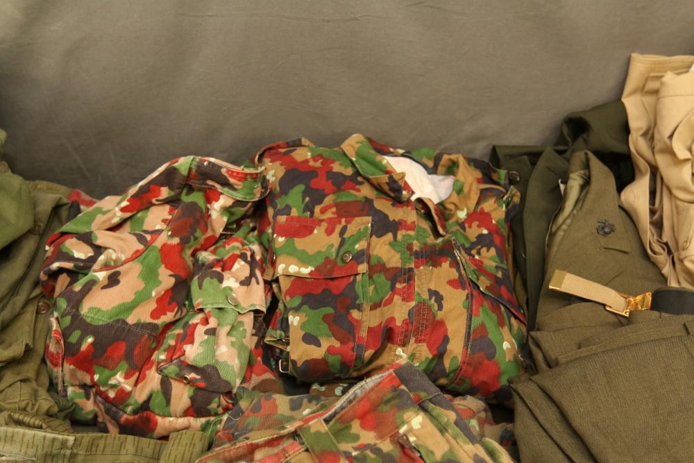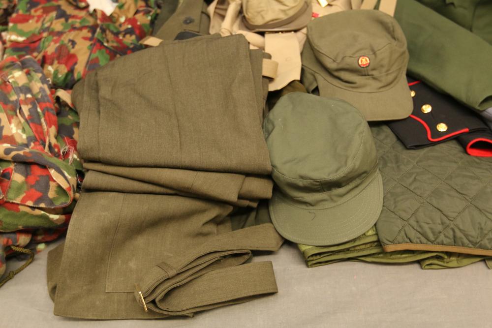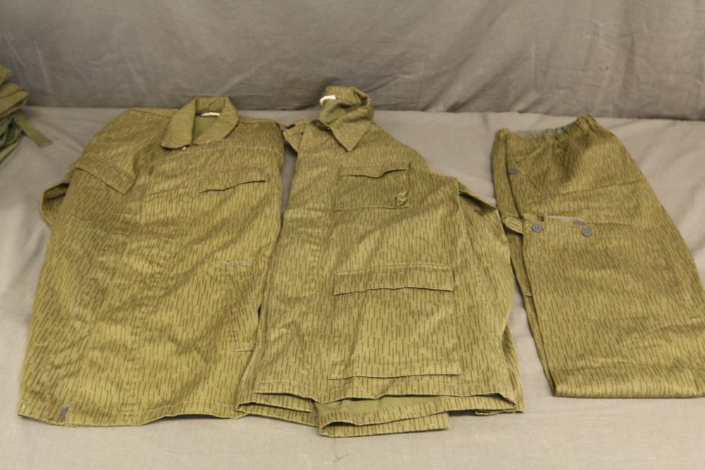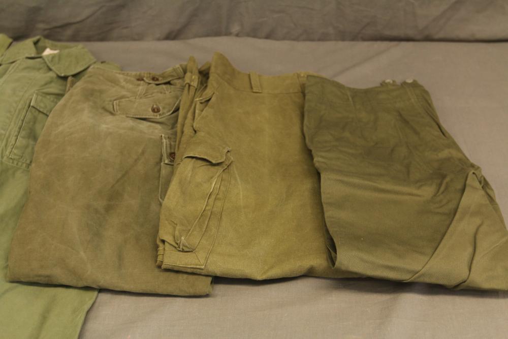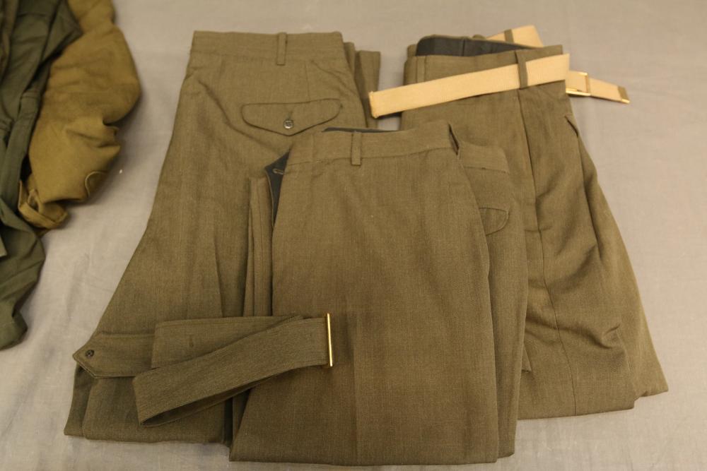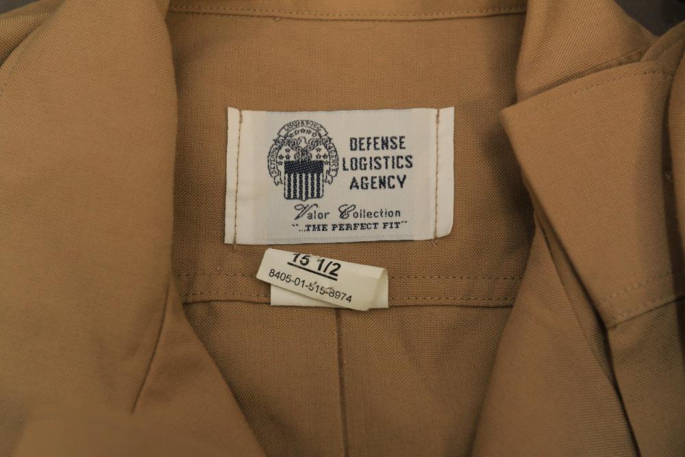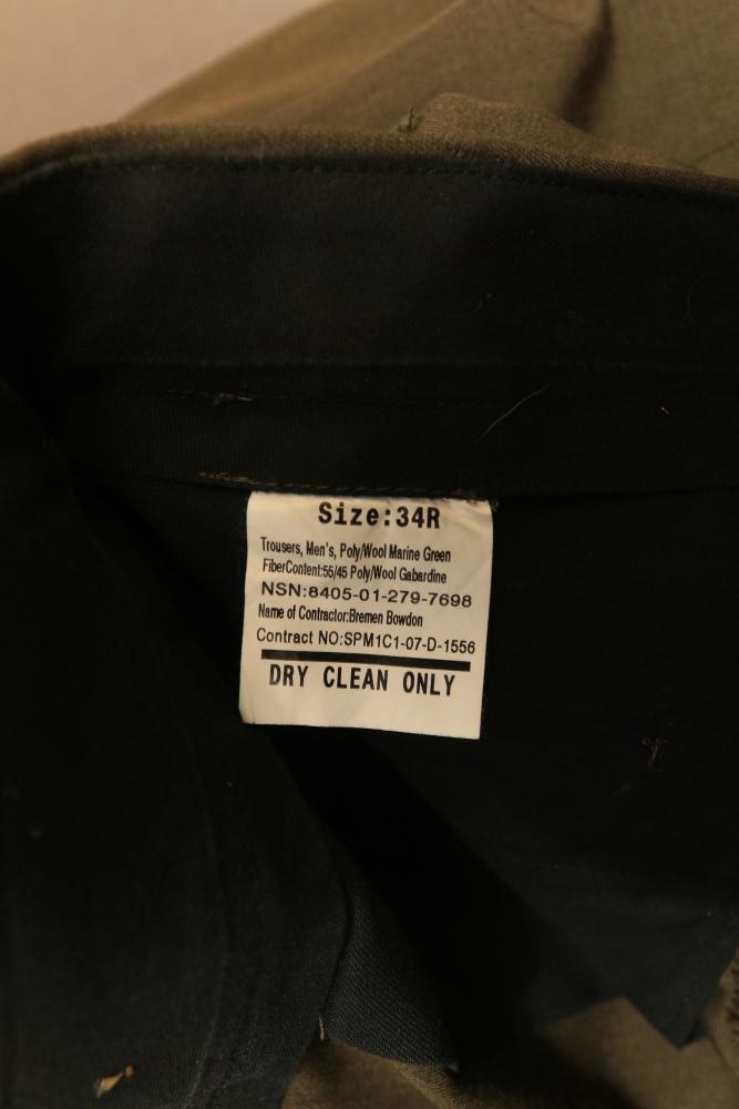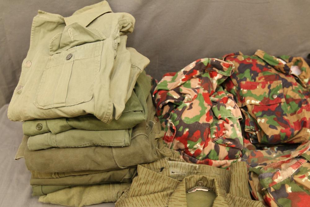 Military clothing incl USMC dress jacket, US Army cadet jacket, three medium down jackets, five tan button down shirts neck sizes 15 1/2 and 16, two having USMC corporal patches, pants sizes 34R and 35XL, USMC jacket having corporal patches "Rifle Expert" pin size 42R, Leibermuster camouflage jackets and overalls, rain pattern camouflage jackets and pants, etc.