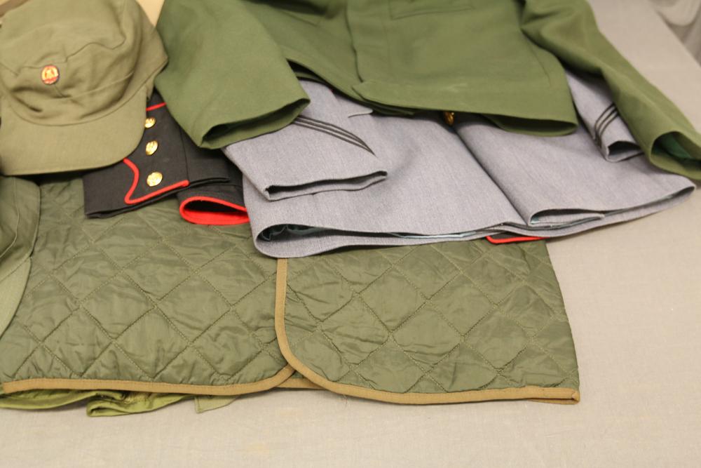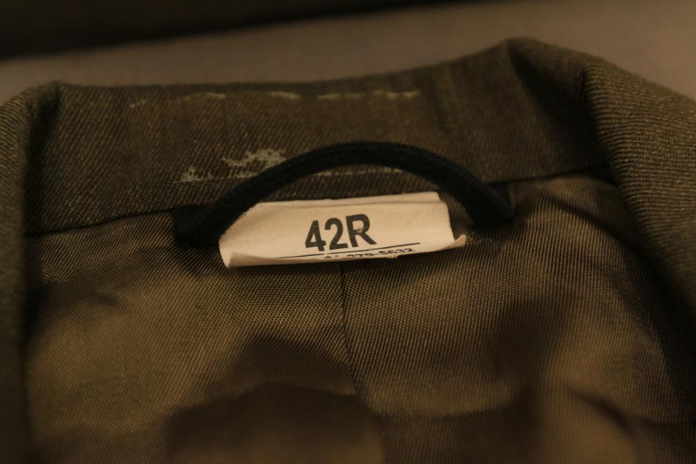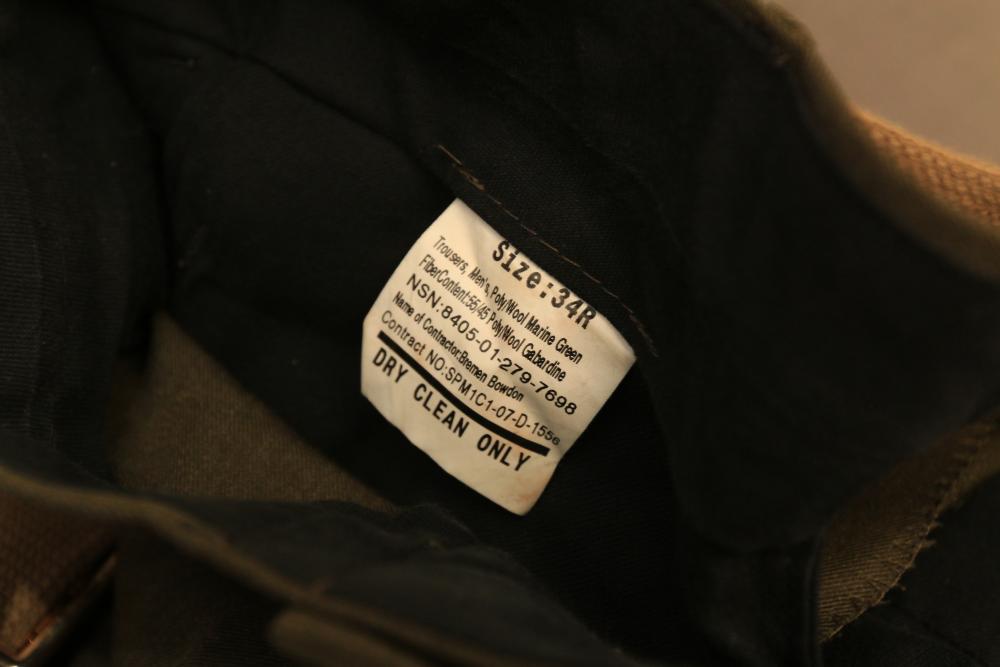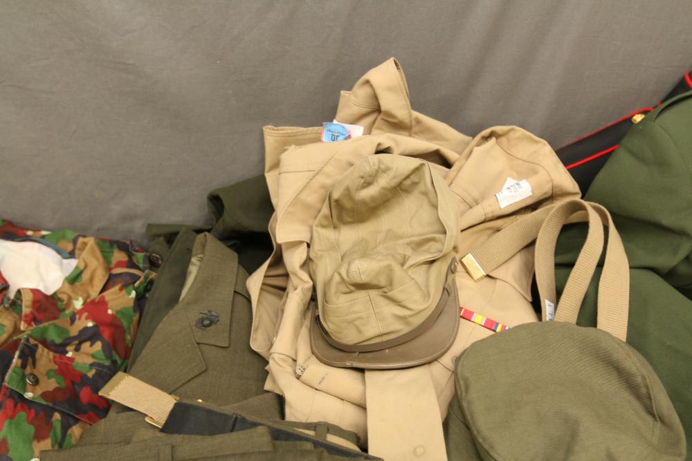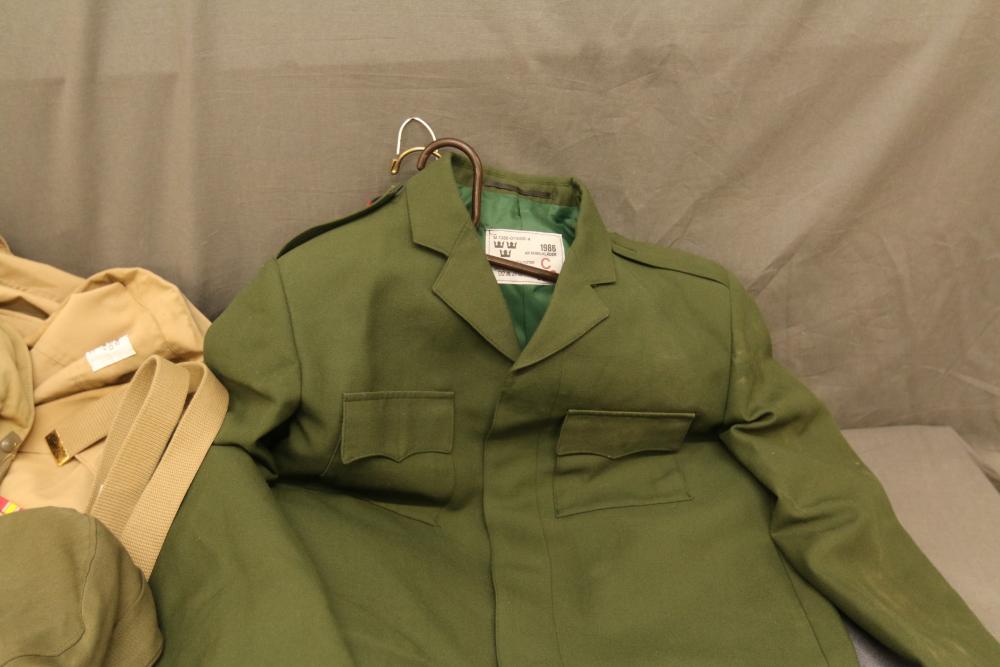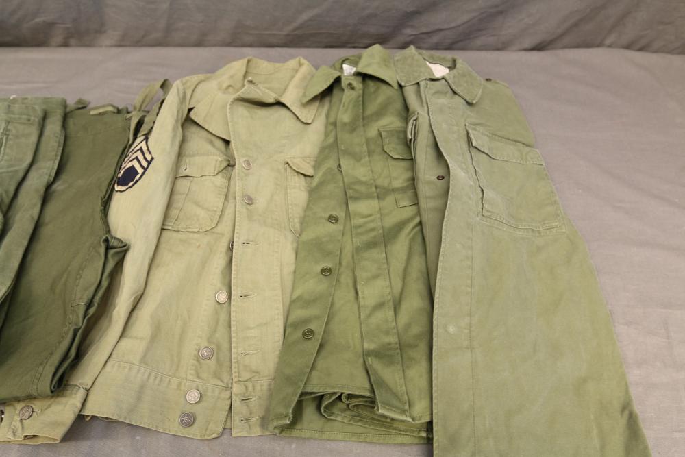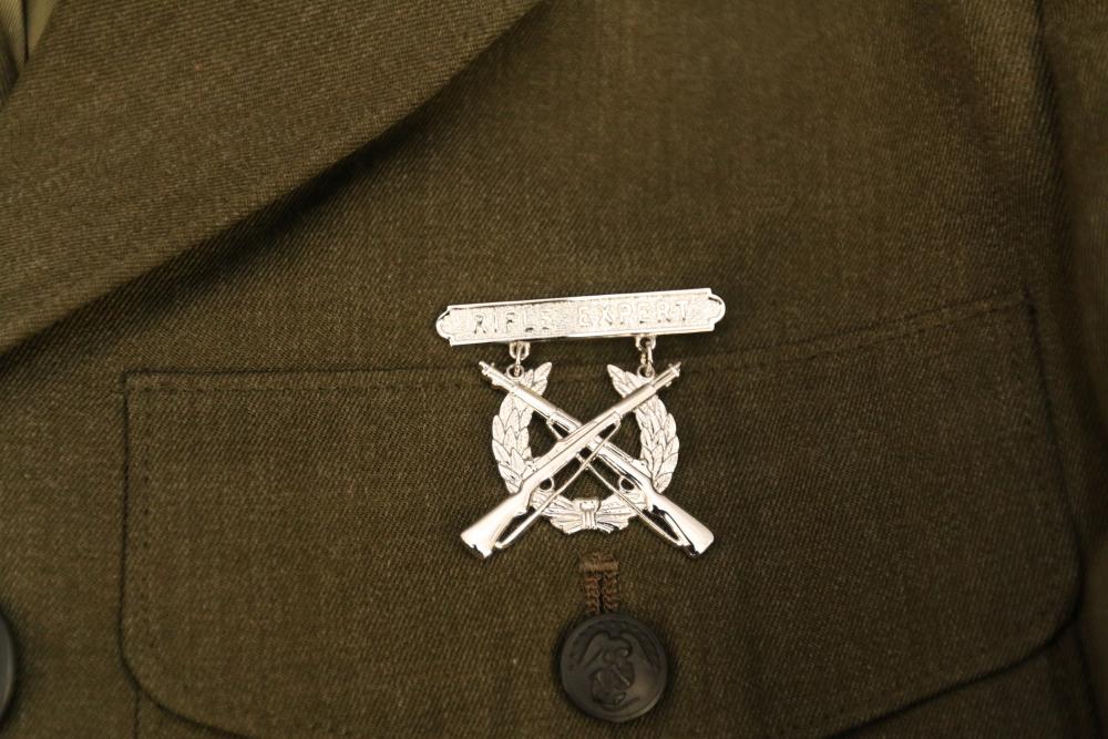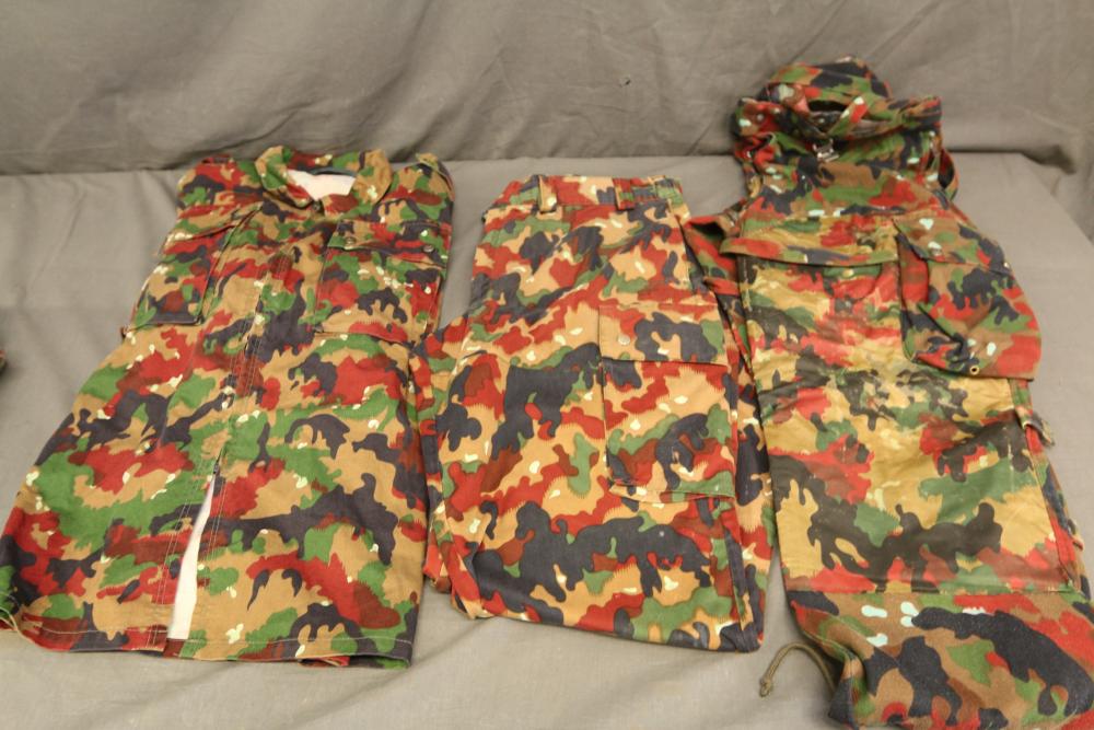 Military clothing incl USMC dress jacket, US Army cadet jacket, three medium down jackets, five tan button down shirts neck sizes 15 1/2 and 16, two having USMC corporal patches, pants sizes 34R and 35XL, USMC jacket having corporal patches "Rifle Expert" pin size 42R, Leibermuster camouflage jackets and overalls, rain pattern camouflage jackets and pants, etc.