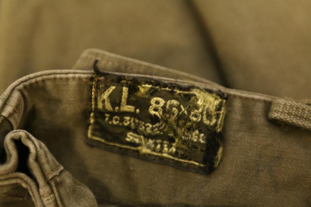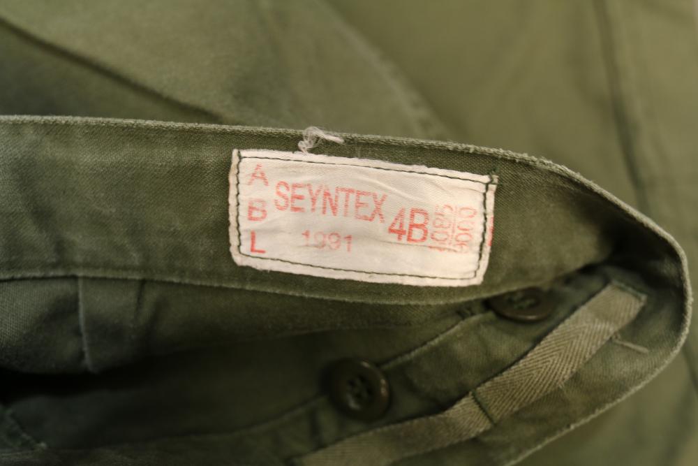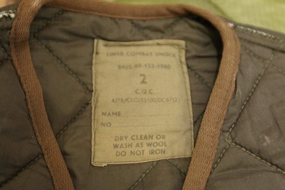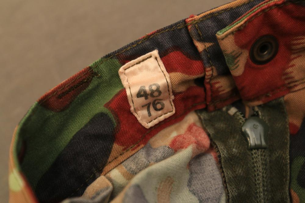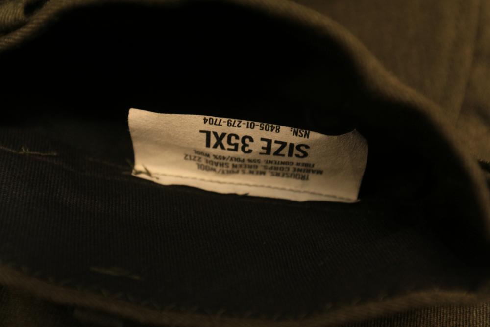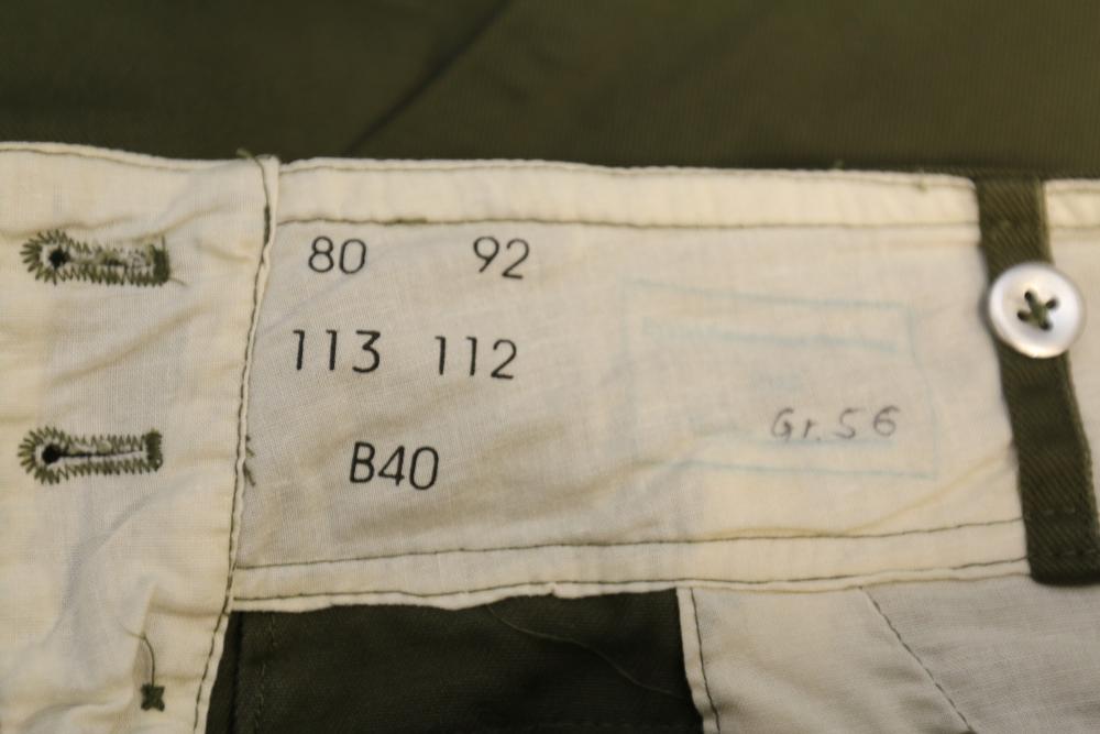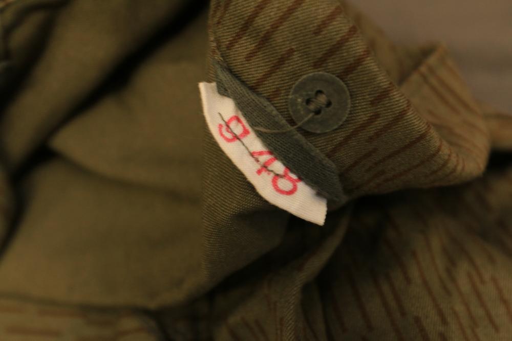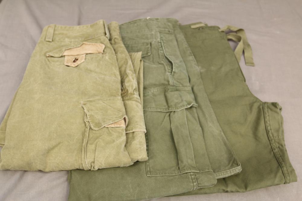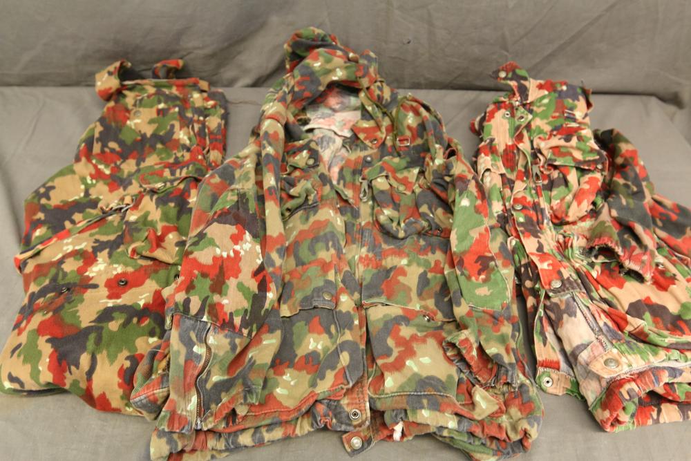 Military clothing incl USMC dress jacket, US Army cadet jacket, three medium down jackets, five tan button down shirts neck sizes 15 1/2 and 16, two having USMC corporal patches, pants sizes 34R and 35XL, USMC jacket having corporal patches "Rifle Expert" pin size 42R, Leibermuster camouflage jackets and overalls, rain pattern camouflage jackets and pants, etc.