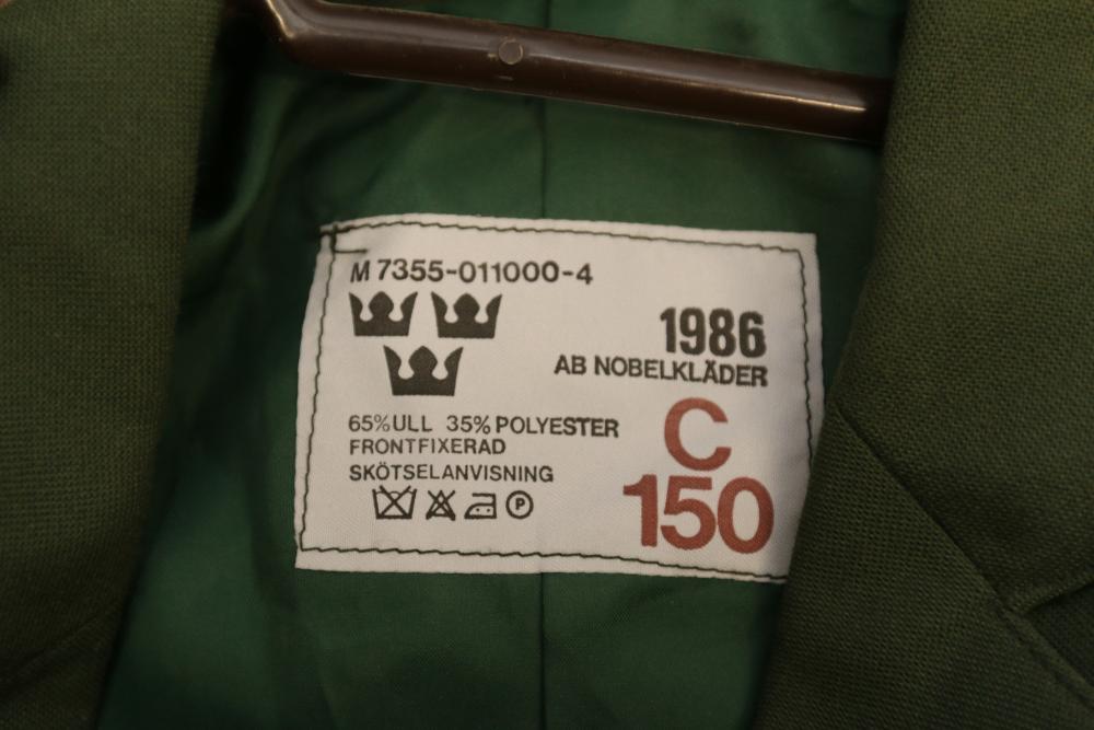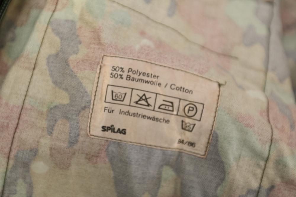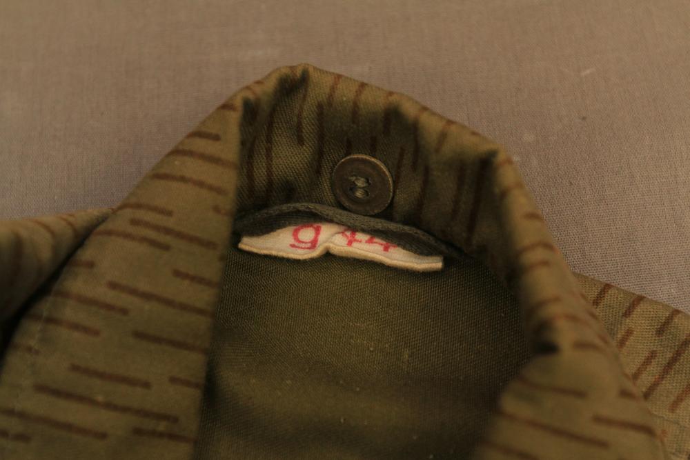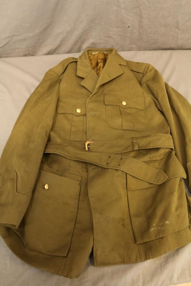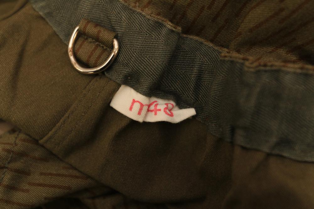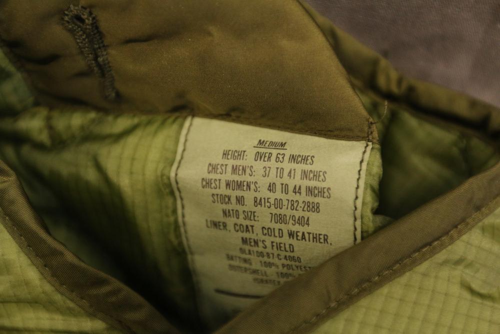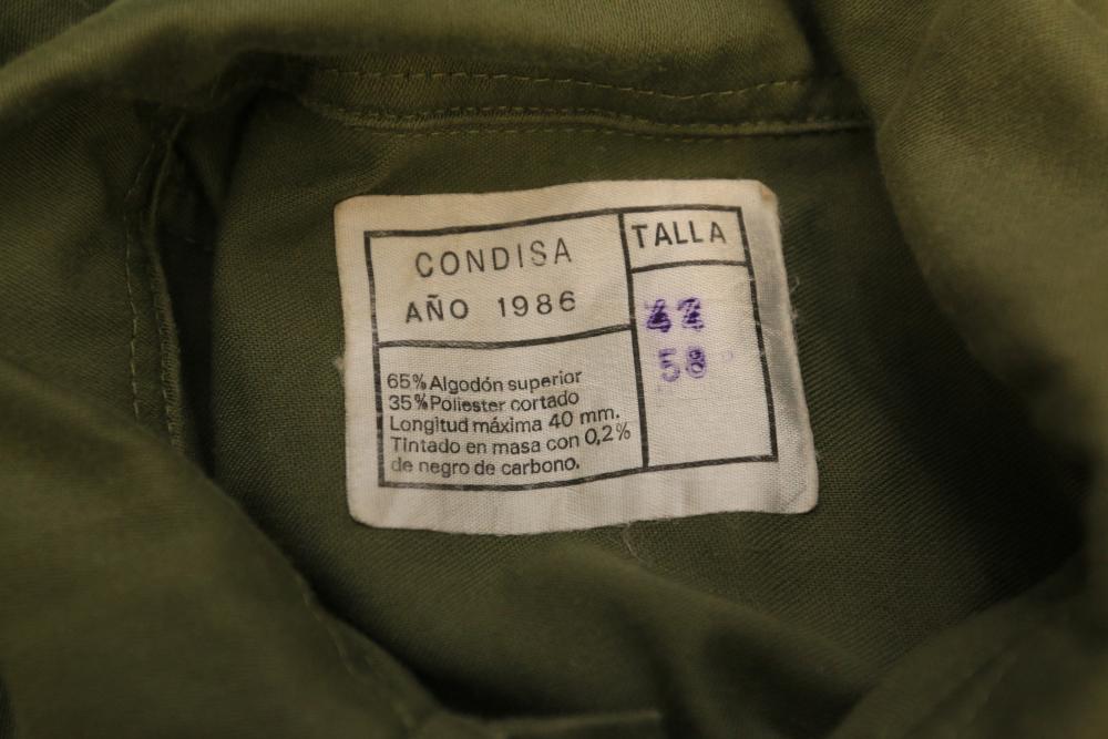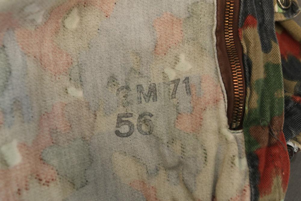 Military clothing incl USMC dress jacket, US Army cadet jacket, three medium down jackets, five tan button down shirts neck sizes 15 1/2 and 16, two having USMC corporal patches, pants sizes 34R and 35XL, USMC jacket having corporal patches "Rifle Expert" pin size 42R, Leibermuster camouflage jackets and overalls, rain pattern camouflage jackets and pants, etc.