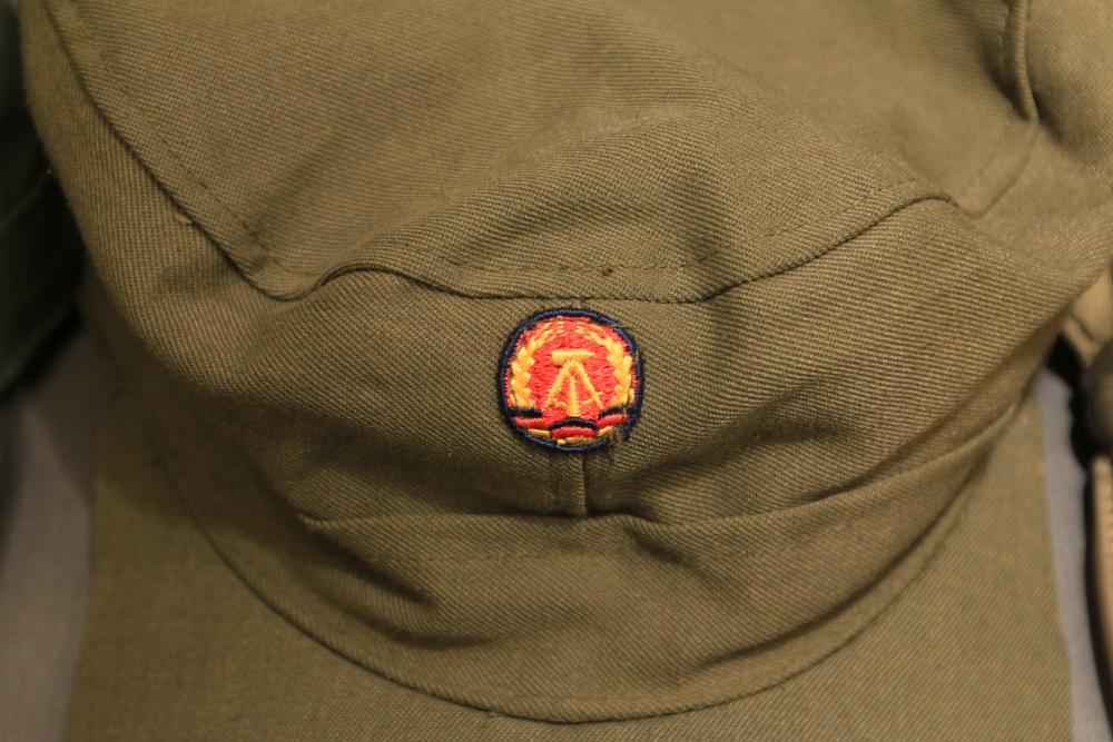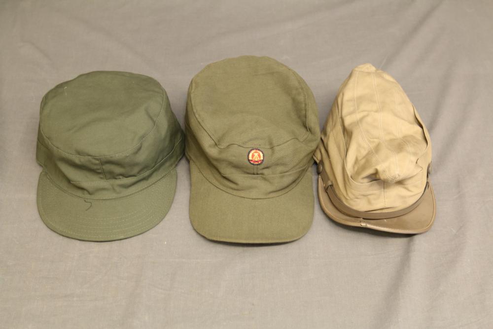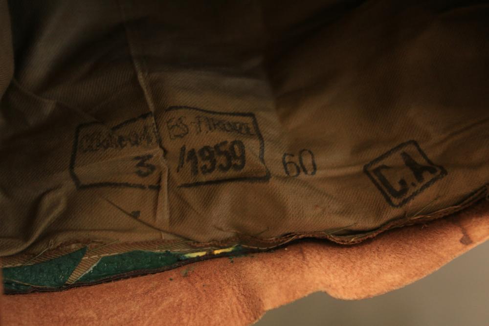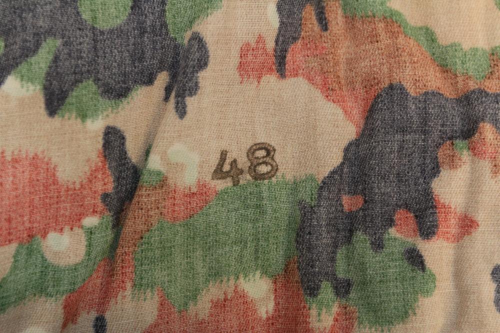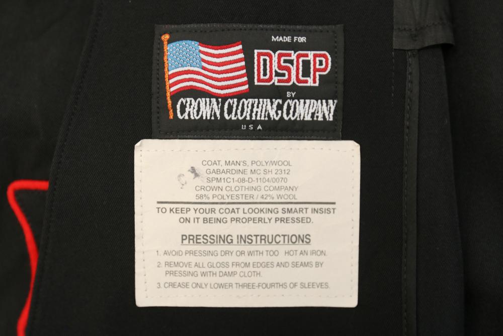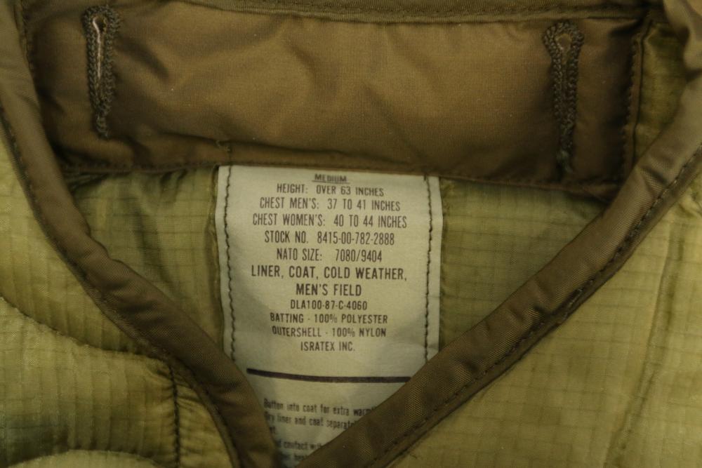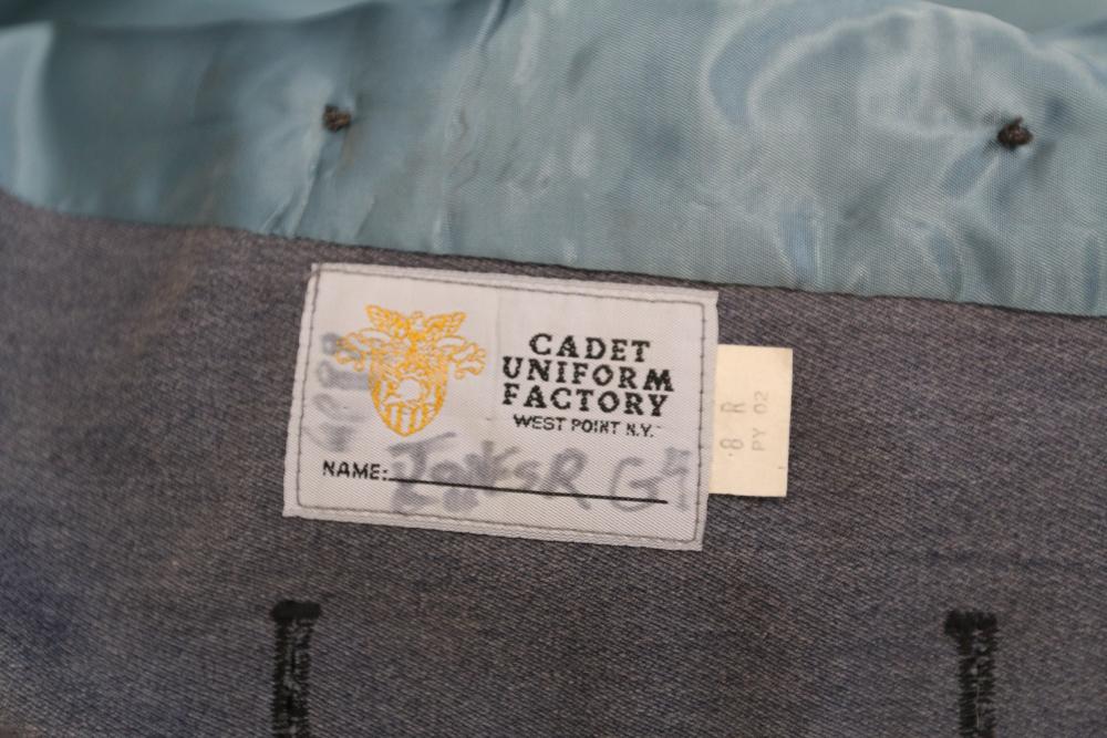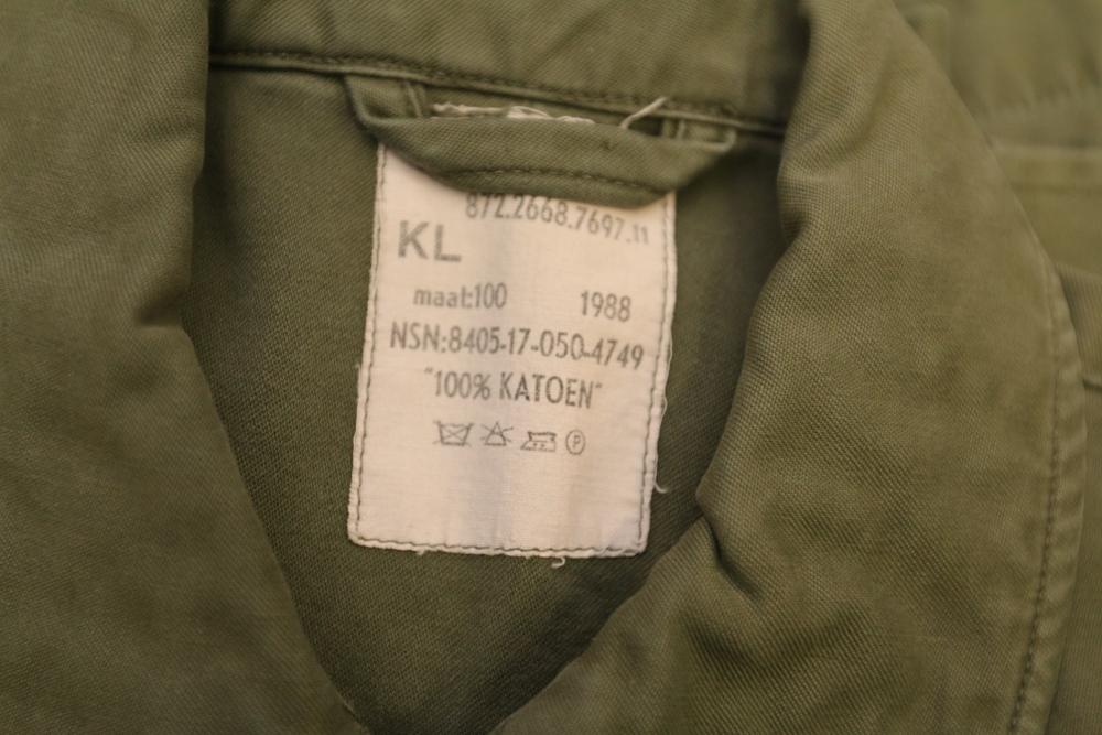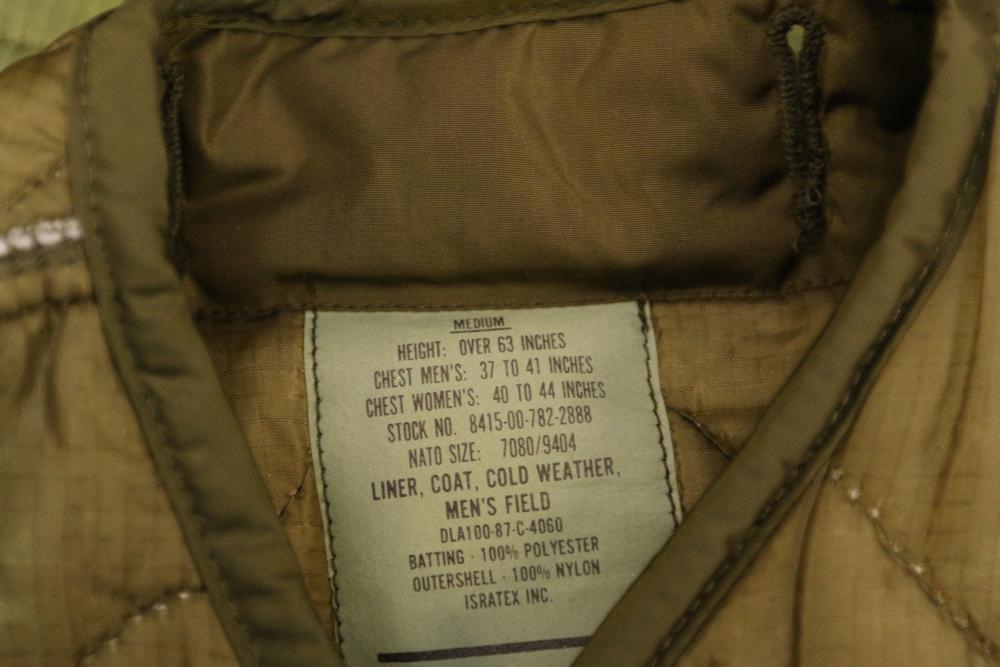 Military clothing incl USMC dress jacket, US Army cadet jacket, three medium down jackets, five tan button down shirts neck sizes 15 1/2 and 16, two having USMC corporal patches, pants sizes 34R and 35XL, USMC jacket having corporal patches "Rifle Expert" pin size 42R, Leibermuster camouflage jackets and overalls, rain pattern camouflage jackets and pants, etc.