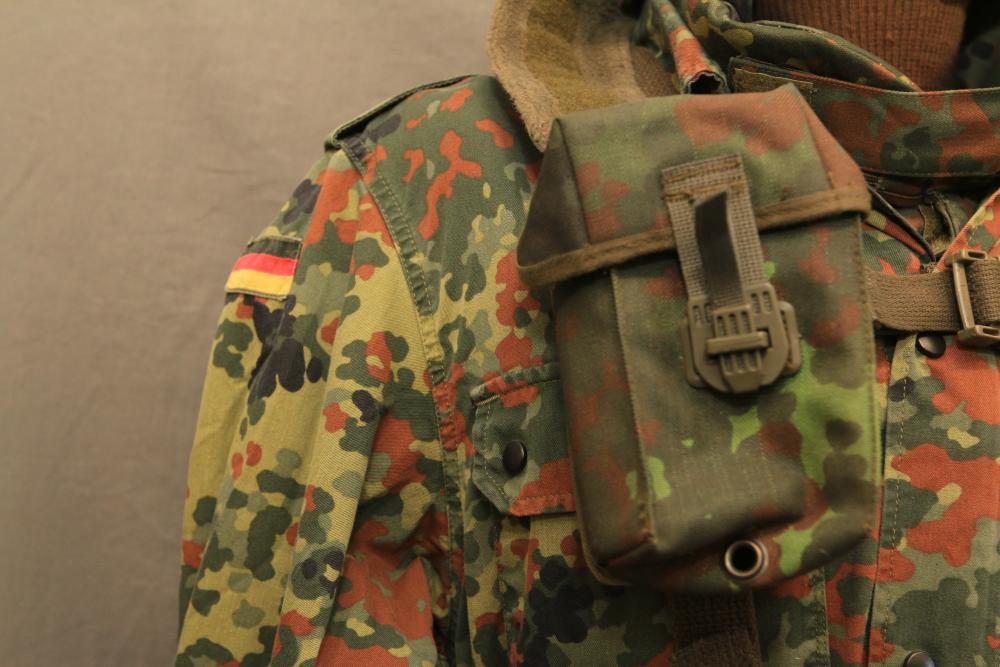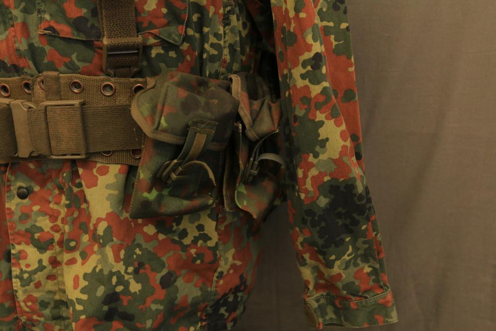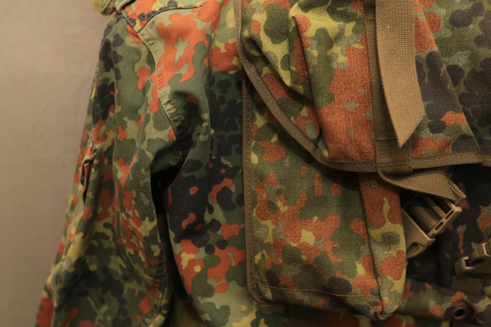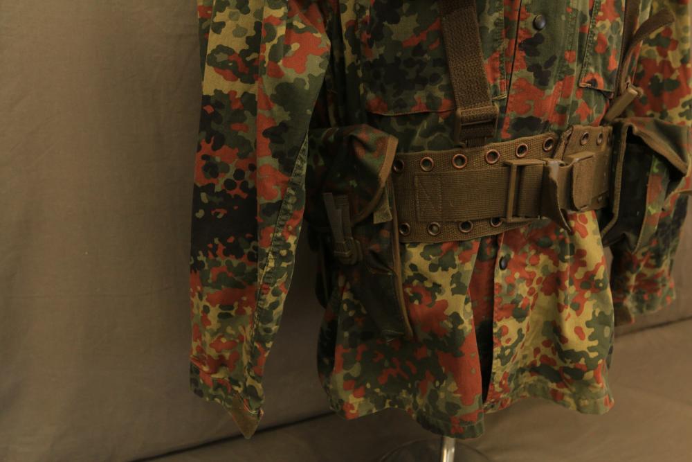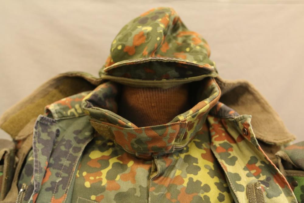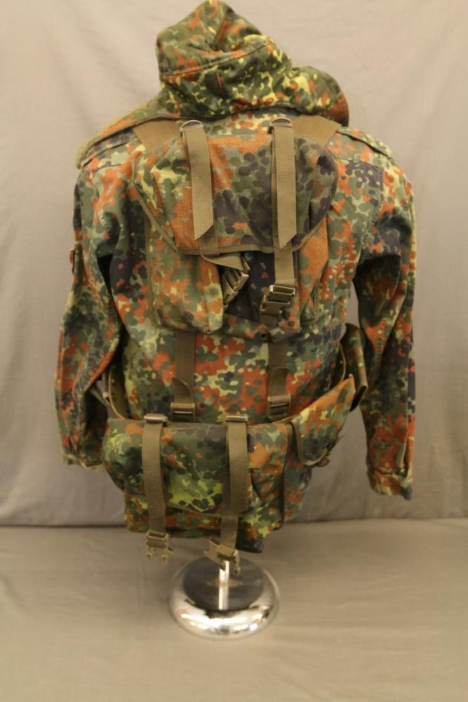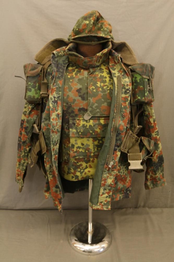 Flecktarn camouflage clothing incl jacket with German flags stitched on sleeves, hat, and protective vest, also having over the shoulder tactical vest. Manikin not included.