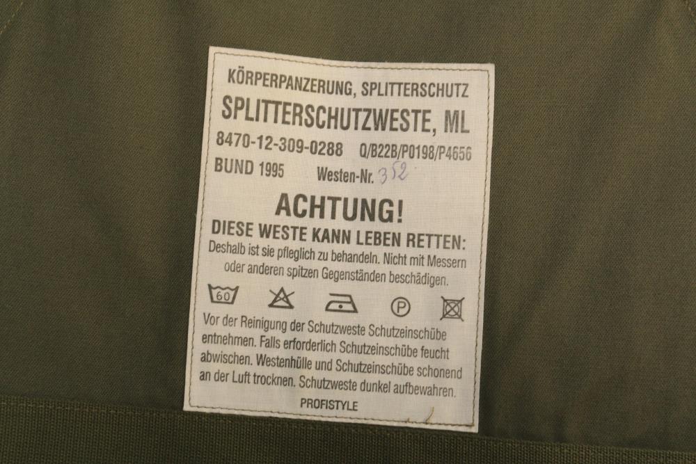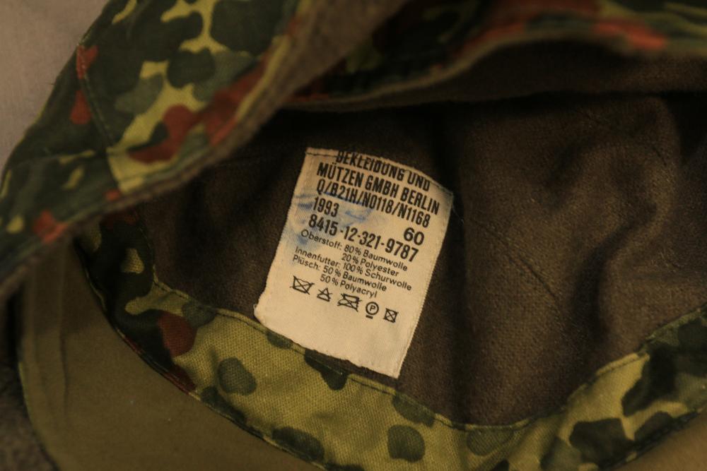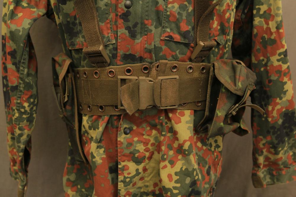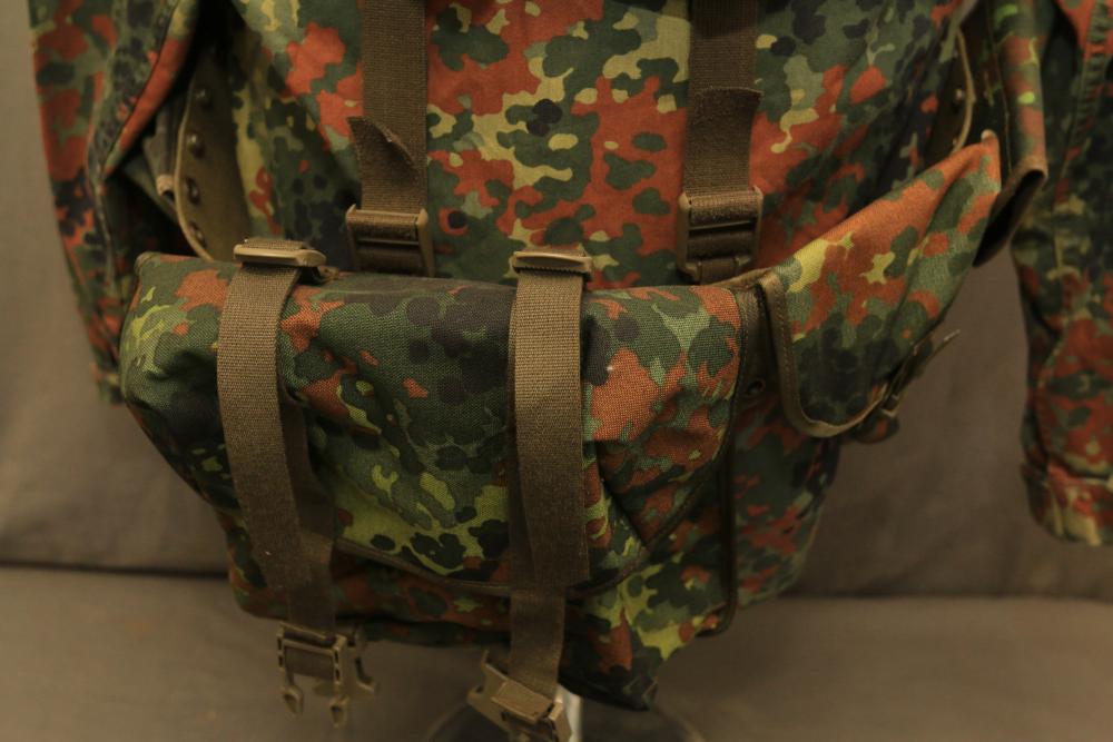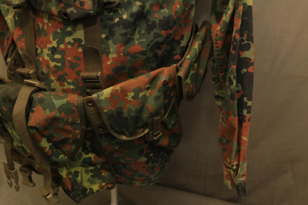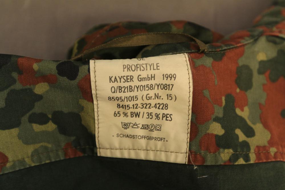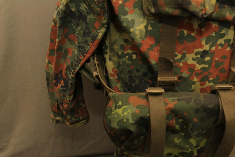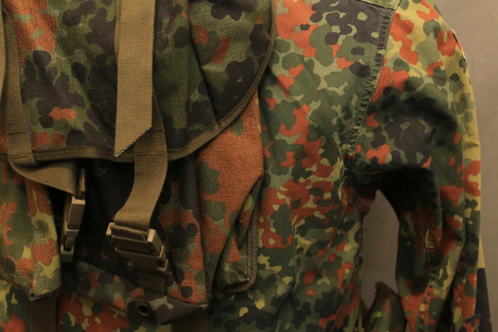 Flecktarn camouflage clothing incl jacket with German flags stitched on sleeves, hat, and protective vest, also having over the shoulder tactical vest. Manikin not included.