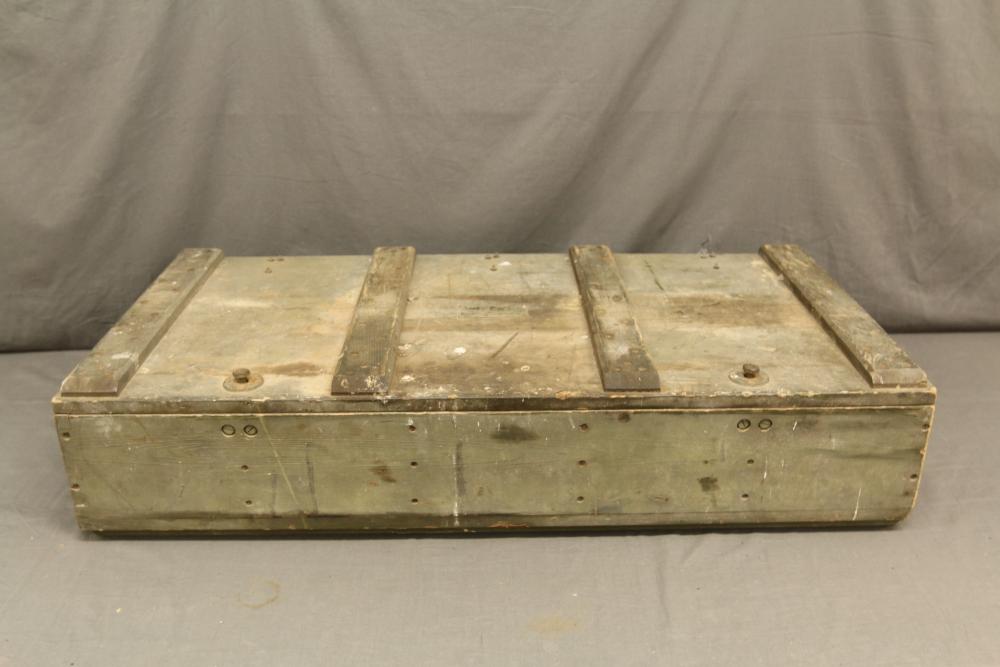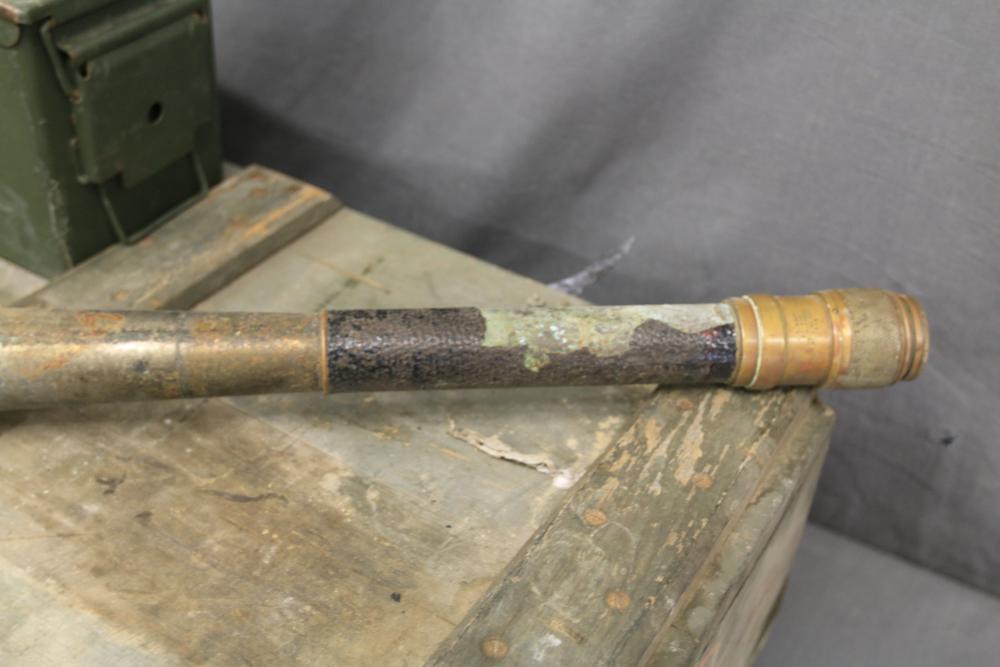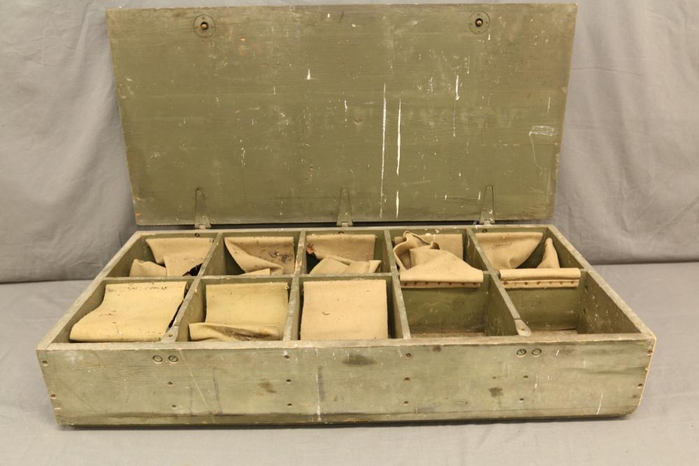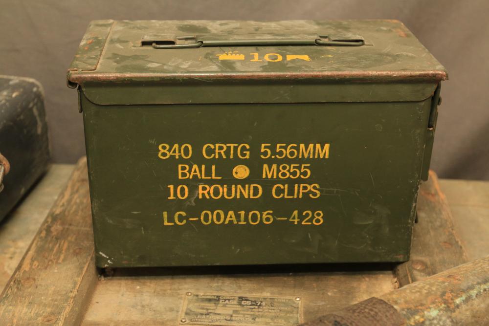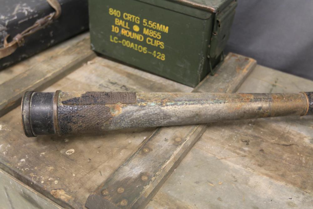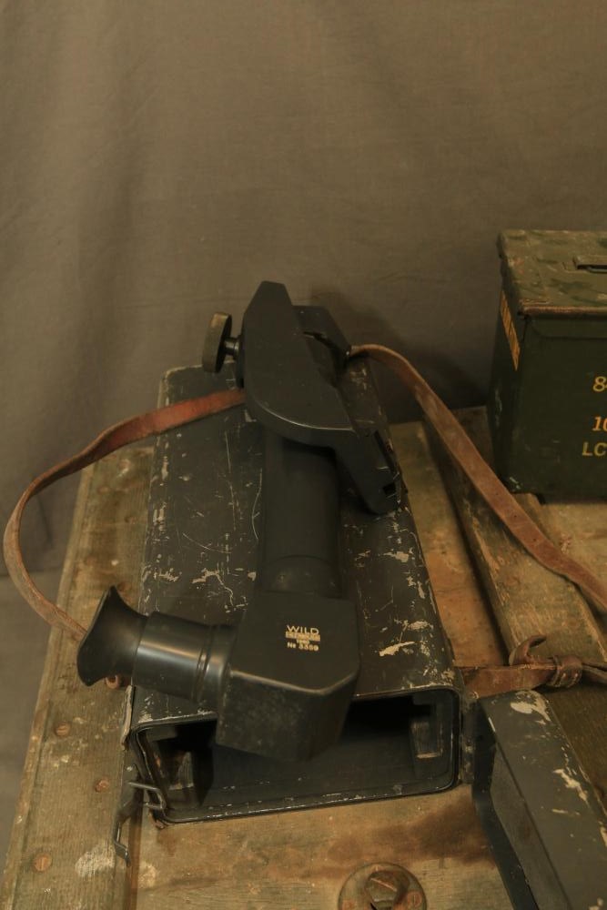 U.S. Navy MK1 spyglass marked "U.S. Navy BU. Nav QM. 16-POWER MK. I NO. 367 1939" 38.5"L, Sanders Bros. Mfg. Co. U.S. Army wooden case model CS-74 having 10 cubby spaces approx 45" x 21" x 9.5"T with lid, Wild Heerbrugg periscope marked "1960 No 3359" in metal case, and metal ammo can marked "840 CRTG 5.56MM BALL M855 10 ROUND CLIPS LC-00A106-428". Pickup only.