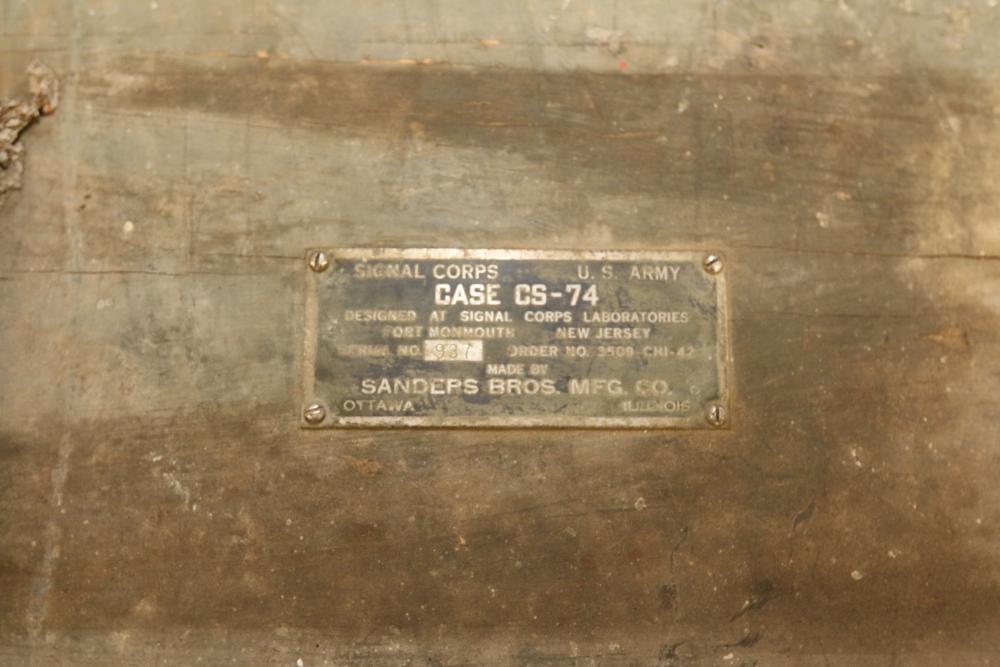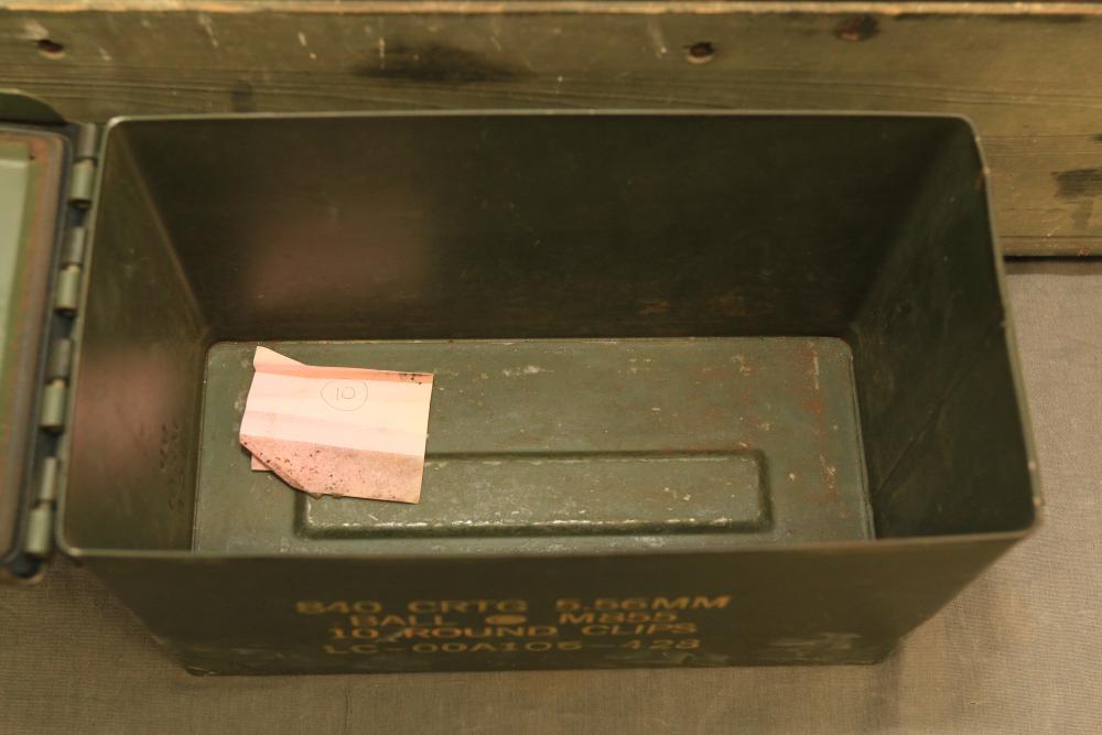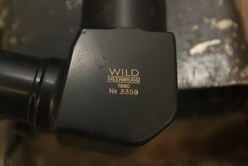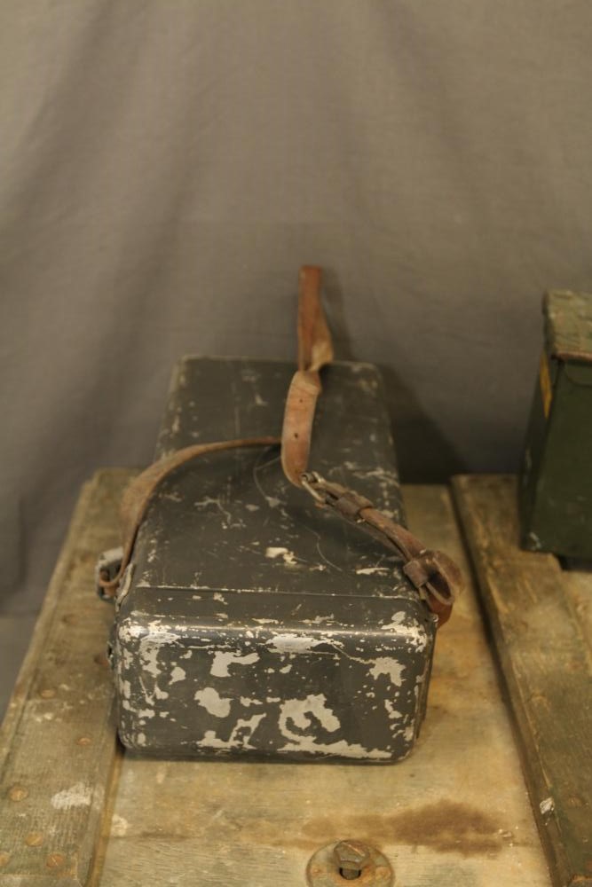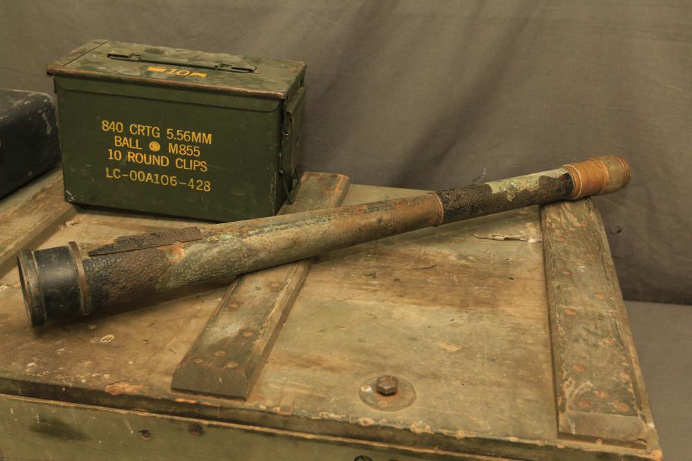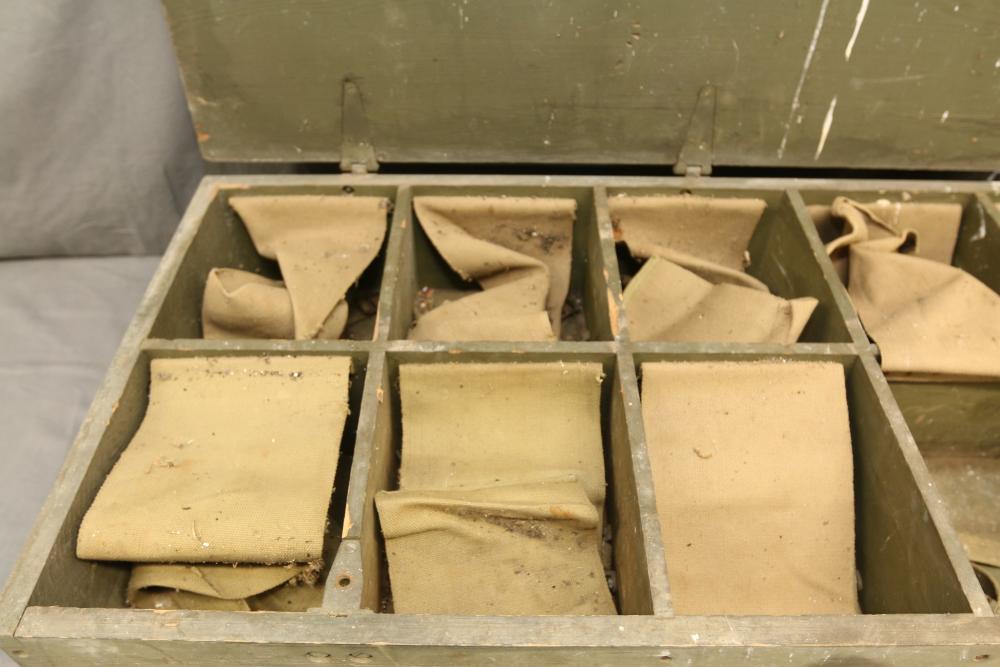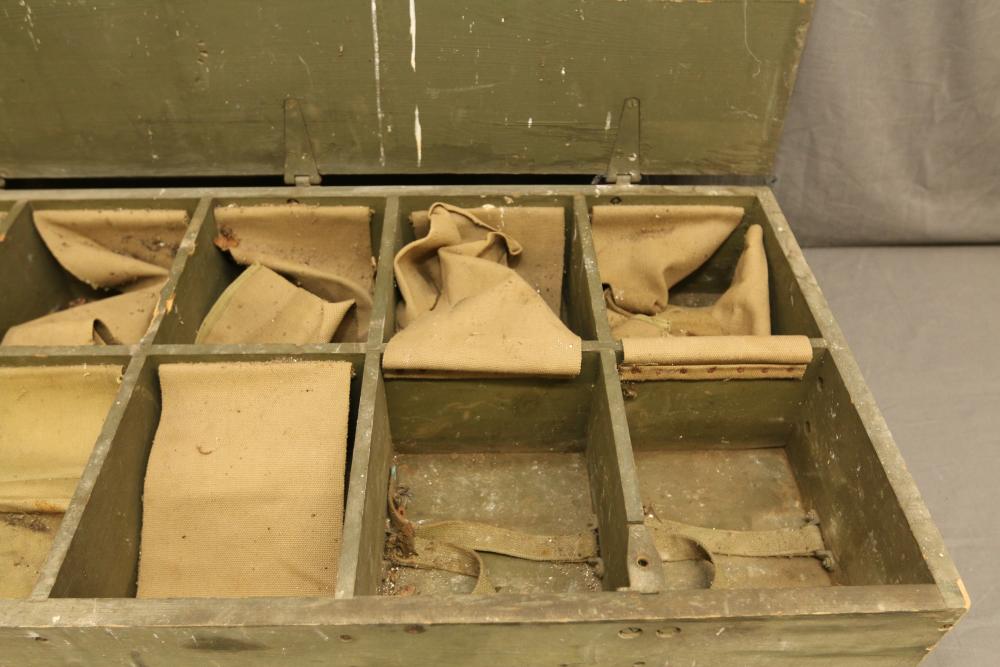 U.S. Navy MK1 spyglass marked "U.S. Navy BU. Nav QM. 16-POWER MK. I NO. 367 1939" 38.5"L, Sanders Bros. Mfg. Co. U.S. Army wooden case model CS-74 having 10 cubby spaces approx 45" x 21" x 9.5"T with lid, Wild Heerbrugg periscope marked "1960 No 3359" in metal case, and metal ammo can marked "840 CRTG 5.56MM BALL M855 10 ROUND CLIPS LC-00A106-428". Pickup only.