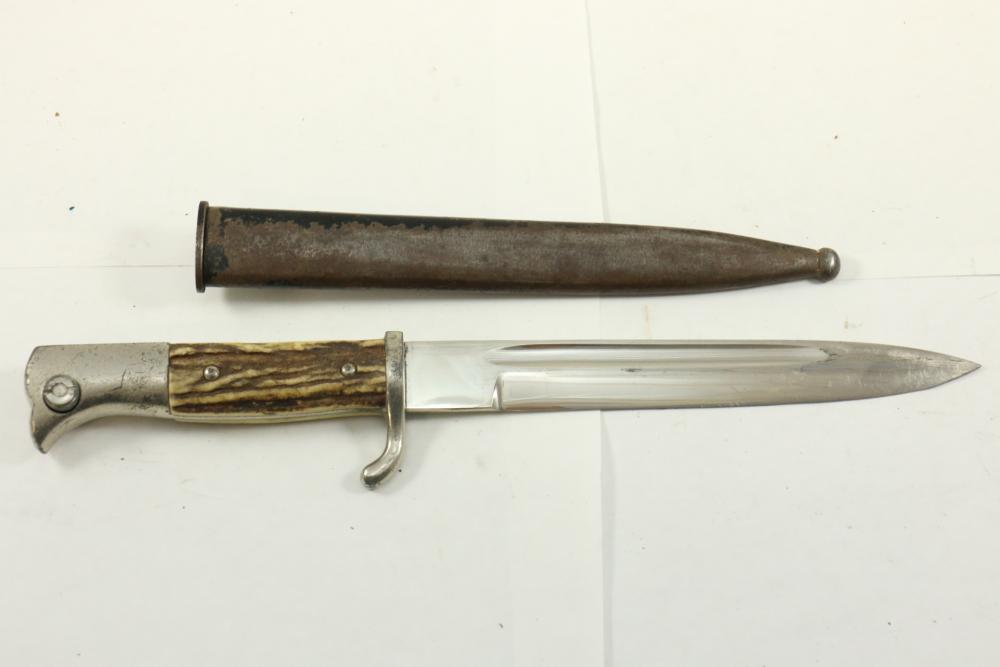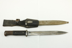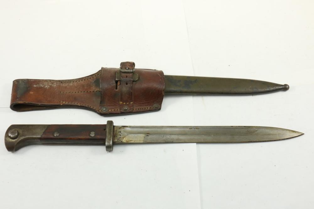 Believed to be W.K.C. K98 bayonet with single fuller on both sides, blade marked "W.K.C." with serial number "383" on reverse, scabbard serial number "2803" and reverse marked "43ASW",length of bayonet without scabbard 15".