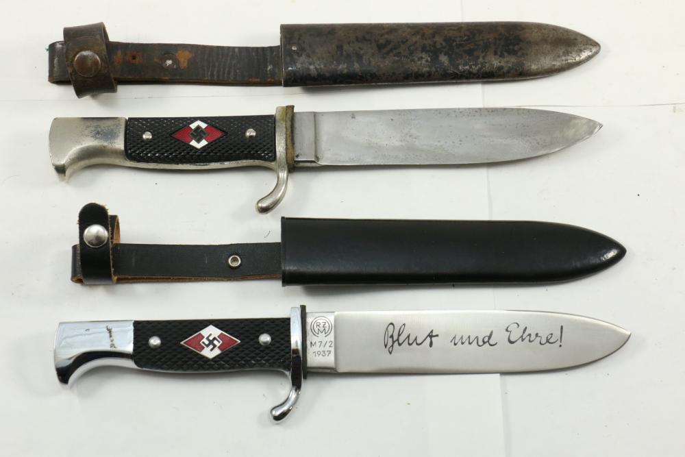 Two WWII German Hitler youth daggers with scabbards one marked on ricasso "RZM M7/56 1942", second marked on ricasso "RZM M7/2 1937", blade marked "Blut und Ehre!"(Blood and Honor!), both daggers without scabbard measuring 9.5"L.