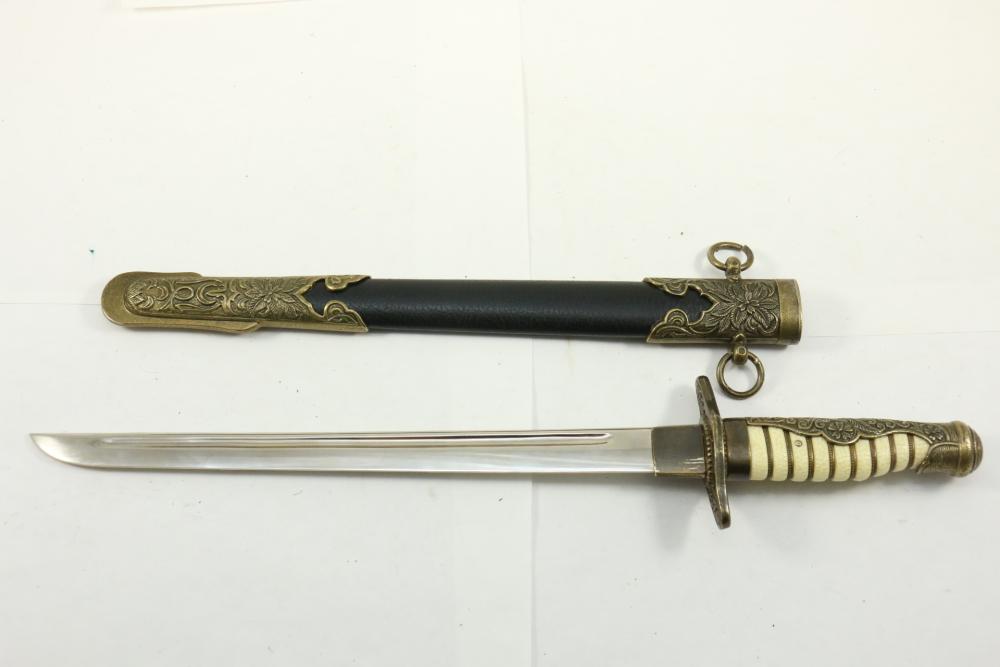 Believed to be Japanese Officers dress dagger in blue leather wrapped sheath, handle believed to be white pebbled ray skin, no visible markings, both dagger and sheath having bronze accents, length of dagger without sheath 15.25"L.