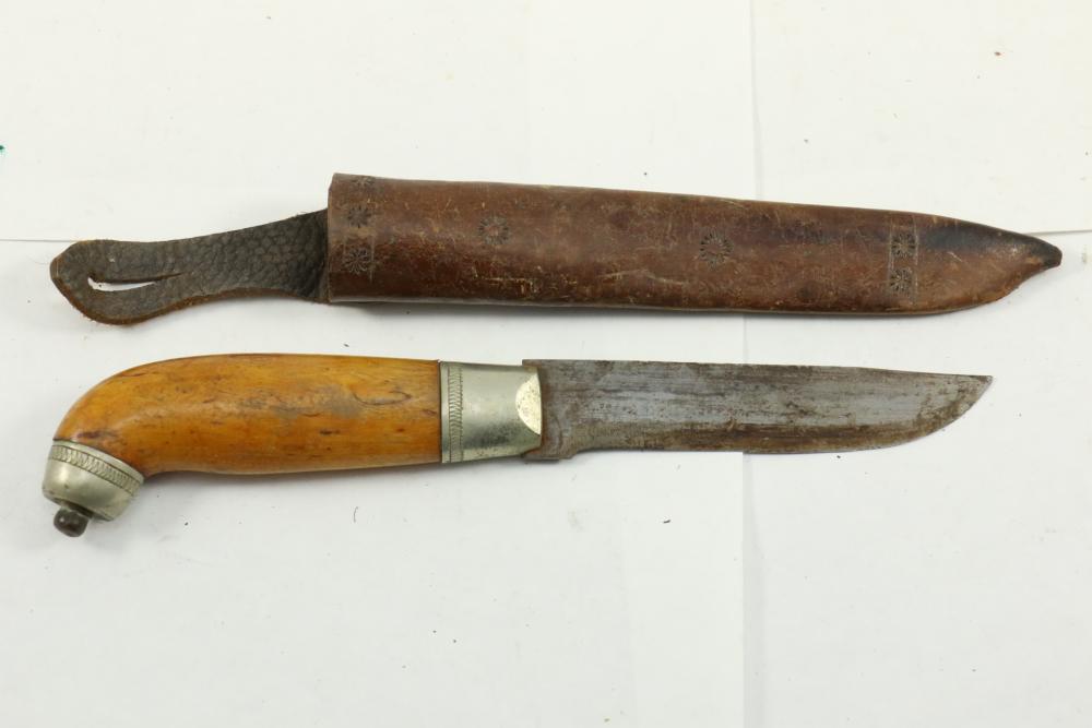 M.J.Dahl Puukko fixed blade knife in scabbard stamped on blade "M.J.Toten" having wood handle, length of knife without scabbard approx 9"L.