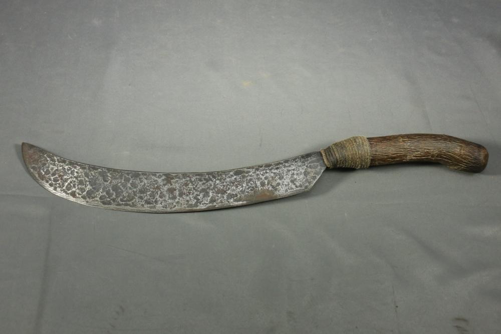 Wood handled scimitar of unknown origin having rope wrap from base of blade to handle, blade measuring 13.5"L, and handle measuring 7.5"L (roped section making up 2" of handle).