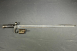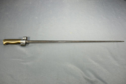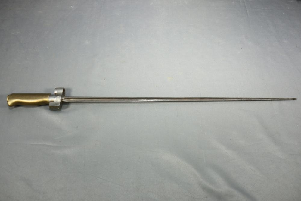 French sword bayonet for Lebel rifle having brass handle and cruciform blade, markings on underside of press stud being "M" in a circle "T45191", and near pommel "G", length of bayonet 24.75"L.