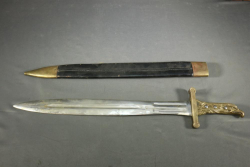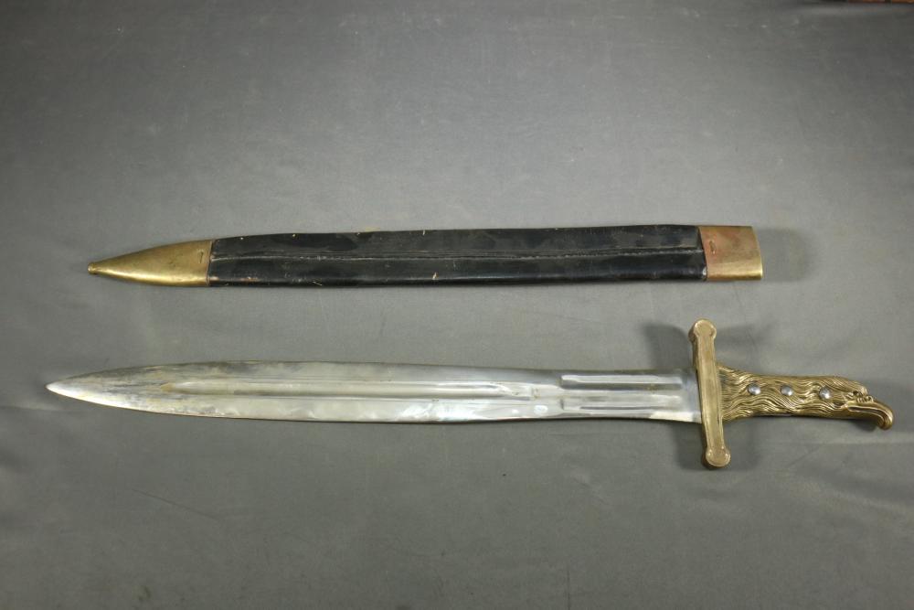 Believed to be reproduction French model 1771 foot artillery short sword with scabbard, brass handle and cross guard (one piece) representing eagle head, fullered blade measuring 18.75"L, cross guard measuring 4.25", cross guard with handle measuring 5.5"L, no visible markings.