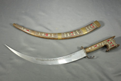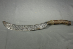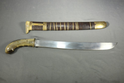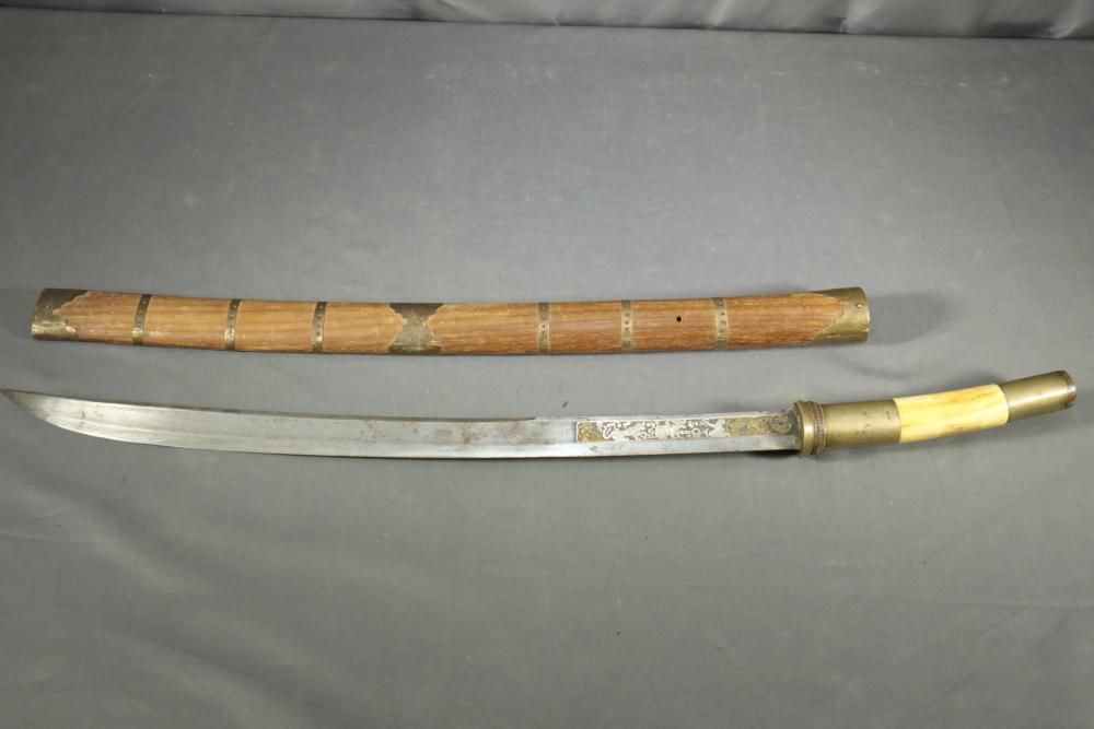 Fighting sword in scabbard believed to be a Burmese Dha having detailed engraving at base of sword on both sides, also having geometric pattern on spine, brass and bone handle, length of sword without scabbard 26"L.
