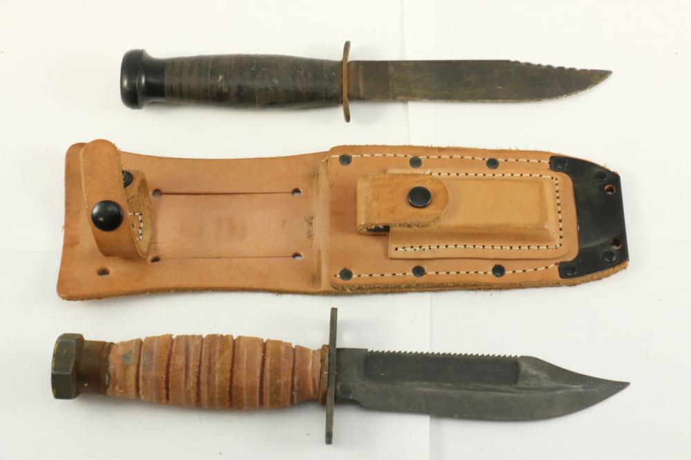 Reproduction Ontario 1986 US Air Force Pilots Survival Knife in sheath with sharpening stone with only visible markings on pommel "Ontario 1-86" single edge blade with a saw back and a blood groove, length of knife without sheath 9.5", also incl Case hunting knife marked on ricasso "CASE" total length of knife measuring 9"L.