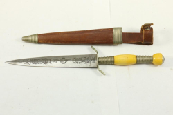 Marked "RJ. Richter Solingen" German double edge knife in sheath, celluloid and one side of blade decorated with three individual designs incl trident, anchor, and believed to be anchor with serpents, length of knife without sheath 10.25"L.