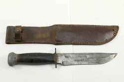 U.S. WWII fighting knife with leather scabbard, marked on blade "RH PAL 36", length of knife without scabbard 10.75"L.