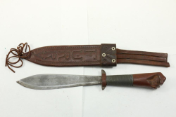 Robert Mole & Sons fighting knife in scabbard wire wrapped wood handle with carved pommel in shape of fist, blade marked "Robert Mole & Sons Birmingham England" with steamer ship in water ser# appearing to read N2B335A, leather scabbard marked "FURRY", reverse marked "2944".