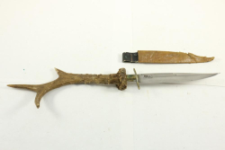 Knife having stag handle, blade marked "M.Hasan", also appearing to be marked "Durca", length of knife without scabbard 14.25"L.