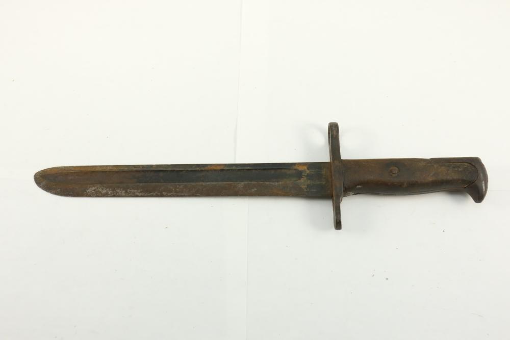 Believed to be US Pre WWI M1905 bayonet marked on ricasso "RIA" over a flaming bomb over "1907", reverse marked "US" over serial number "113921", wood handle believed to have been replaced, length of bayonet measuring 13.5"L.