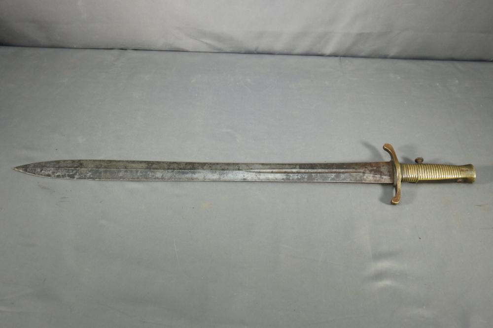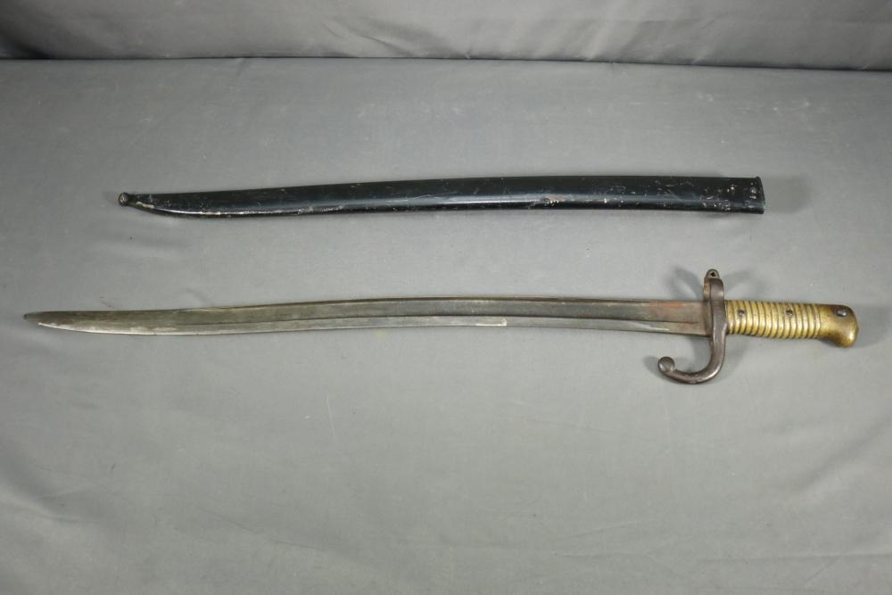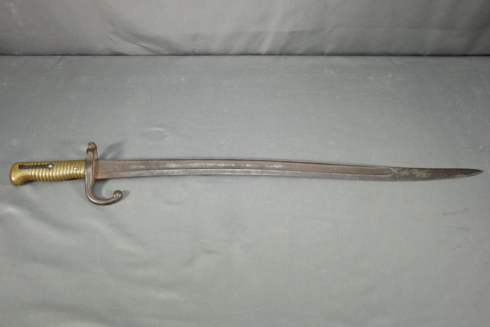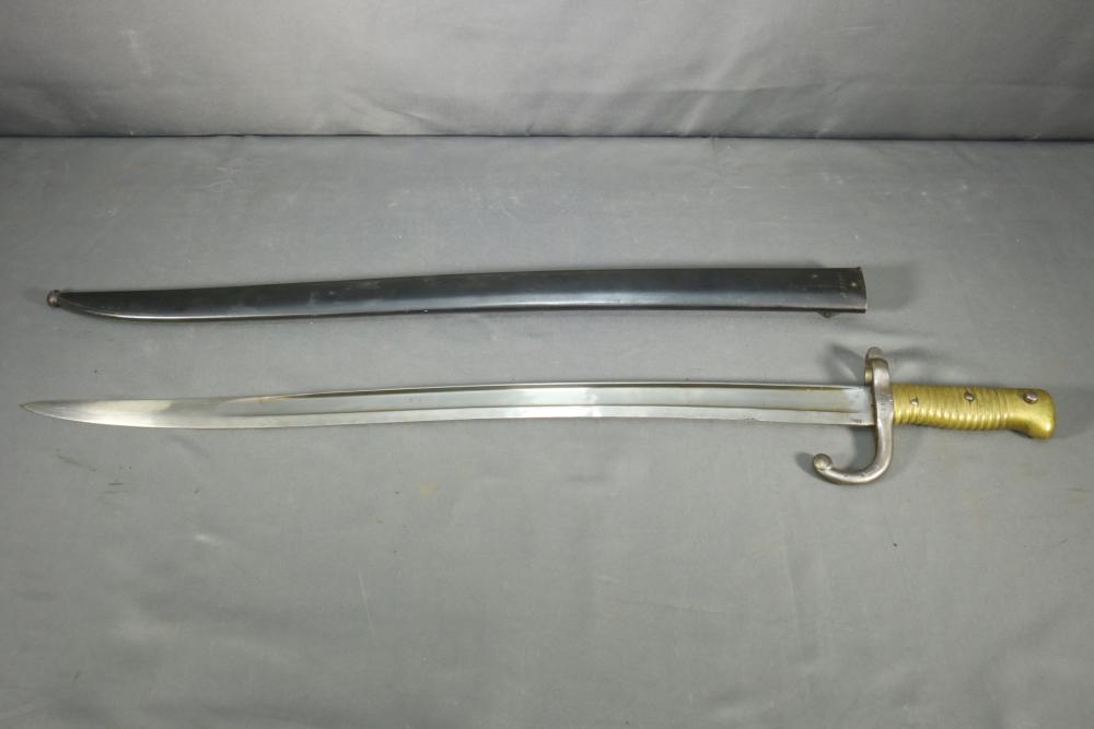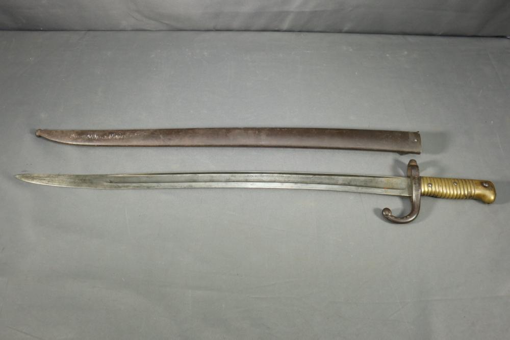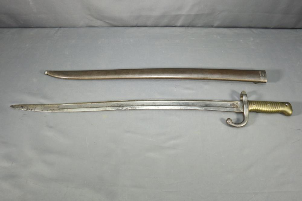 French Yataghan sword bayonet for M1866 Chassepot needle-fire rifle, having brass handle, ricasso marked with a "S" in a circle under a star and an "F" in a circle, cross guard with hallmarks and serial number 7936 spine marked appearing to read "M re Imp ale de Chat a-A**** 1870" (asterisks represent illegibility), serial number on scabbard A 28265, total length of bayonet measuring 27.5"L.