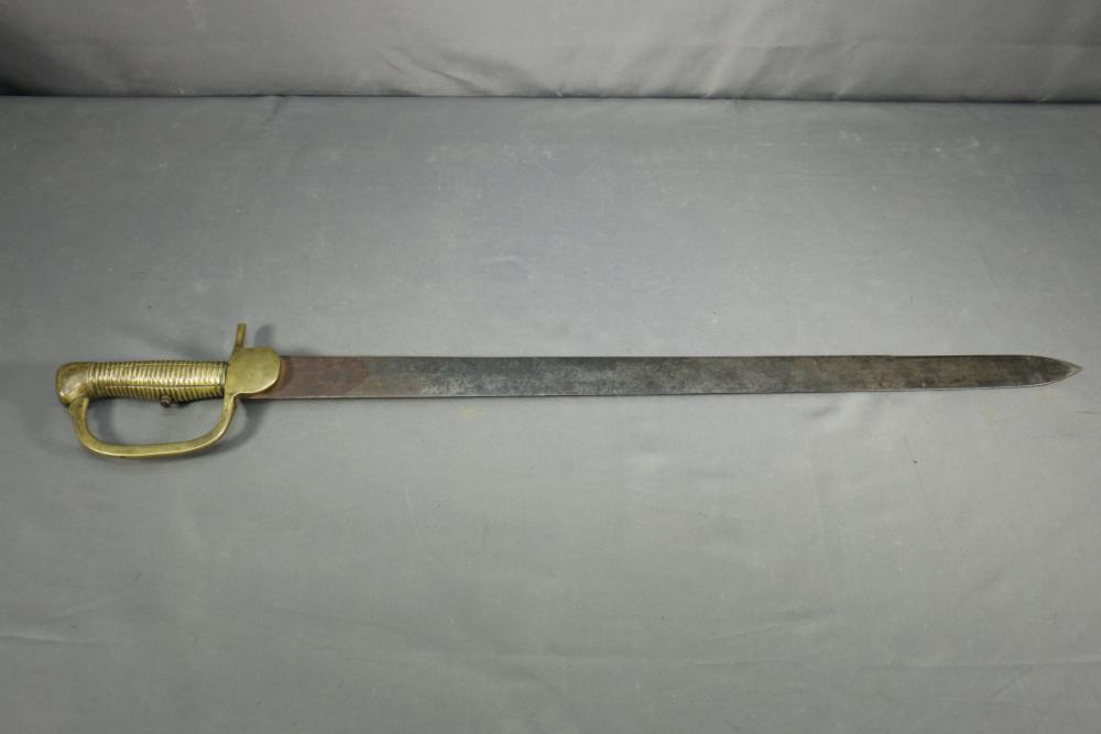 Believe to be pattern 1801 Baker sword bayonet having brass handle and "D" guard, spine with only visible markings appearing to read "W K & Co", blade measures 22.75"L, false-edged portion measuring 5-3/8"L, handle measuring 4-3/8" total length of bayonet measuring 27.5"L.