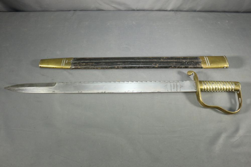 Robert Mole & Sons pioneers short sword with saw back blade in scabbard marked on ricasso "3/93", and on reverse an arrow over "WD" over a crown over "B" over "25, over "Mole Birmm", blade marked "Rob Mole & Sons Makers Birmingham", cross guard marked with the letter "N", pommel side of handle having crows feet style decoration, scabbard marked on upper brass portion with a crown over "43" over "W", length of sword without scabbard 27.75"L.
