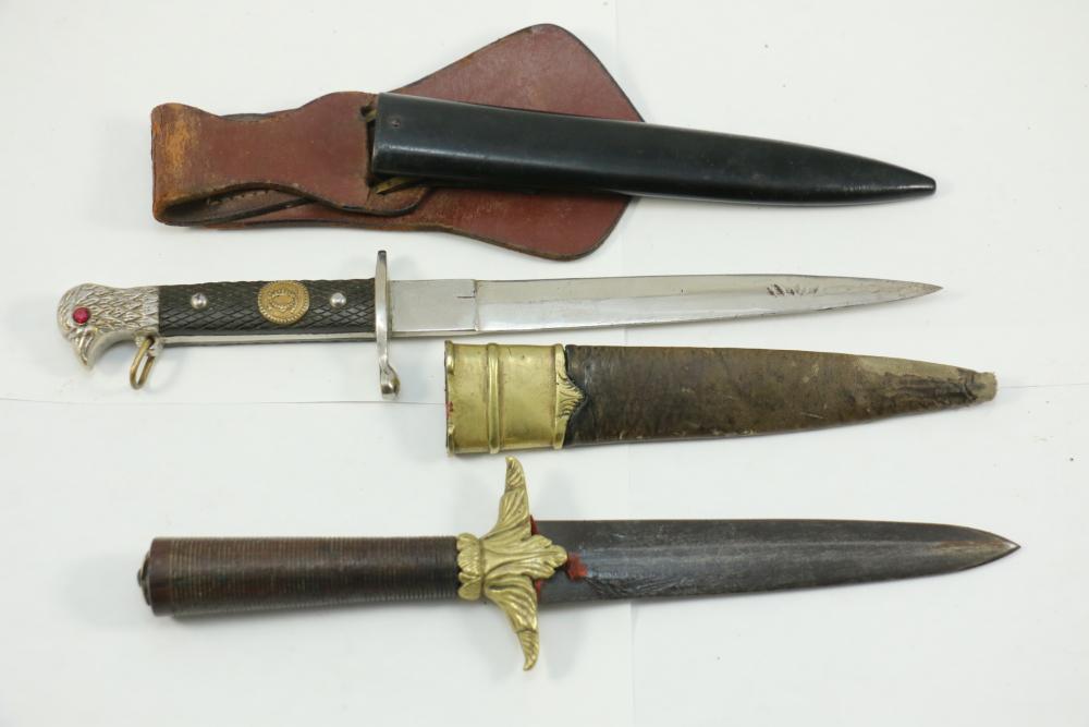 Two unidentified knives both in scabbards one with brass cross guard and flower shaped pommel scabbard having brass accents length without scabbard 10"L, second having eagle pommel with red glass eyes, applied interlocking "C" design on handle, length of dagger without scabbard 10.5"L.