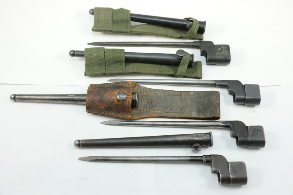 Four Lee-Enfield spike bayonets with cruciform blades incl one believed to be No.4 MK1 having single forged bayonet and socket, one marked "No.4 MKII" in scabbard also marked "No.4 MKII", one marked appearing to read "PMKII*" in scabbard with only visible marking being "I" in a circle, and one with no visible markings (same as scabbard), largest without scabbard measuring 10-1/16", shortest without scabbard measuring 9-13/16".