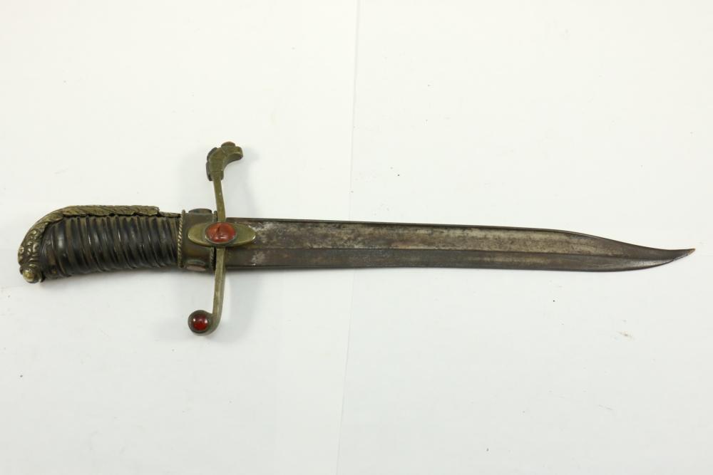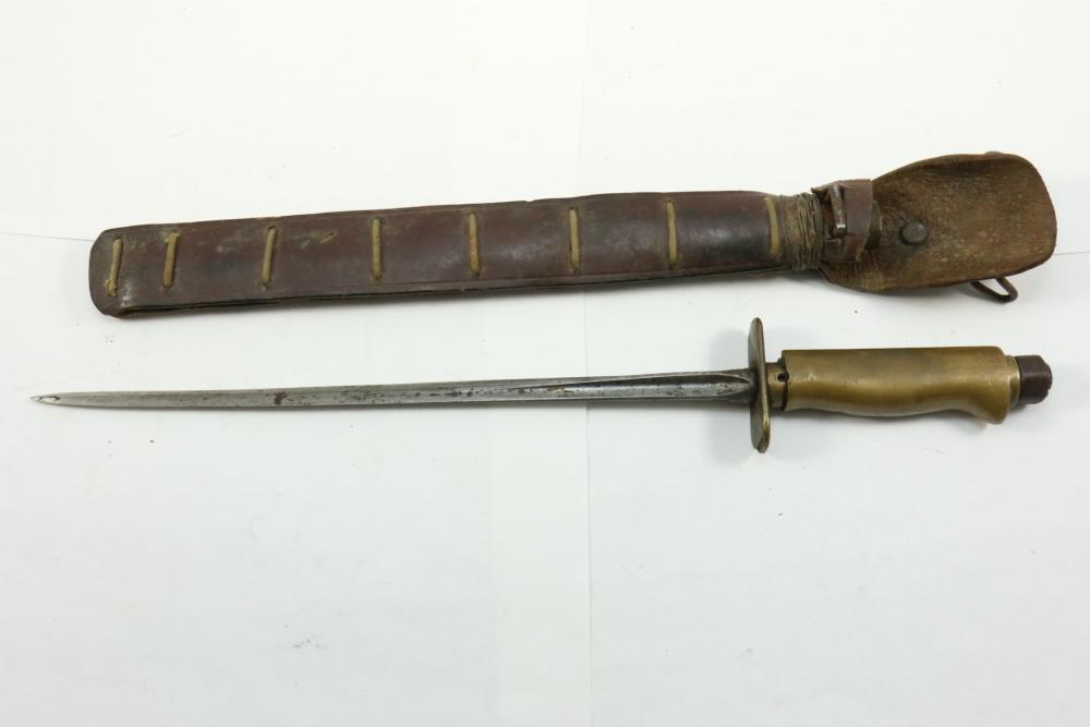 Believed to be cut down 1866 chassepot sword spine having only visible markings incl "Mo re Imp" remainder of writing illegible, brass cross guard, and animal head pommel originating at cross guard blade measuring 10.75"L, handle including cross guard measuring 5", total length 15"L.
