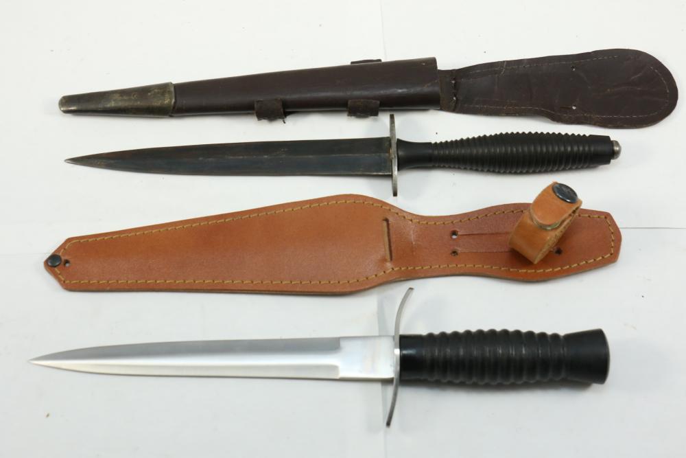 Reproduction British Commando 7" fighting knife attributed to Fairbairn-Sykes, no visible markings, length of dagger without scabbard 13.25"L, also incl dagger marked on blade " Muela Molibdeno Vanadiq Made In Spain" with no additional markings length without scabbard 11.25"L.