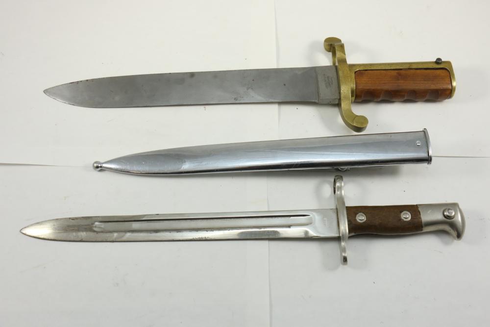 Two bayonets incl Dahlgren type bowie bayonet marked on ricasso "USN D.R. 1862" reverse marked "Ames MFG Co Chicopee Mass.", having wood handle with brass cross guard that runs to pommel, pommel marked in cursive "DR" in a circle 16-7/8"L, second bayonet marked on ricasso "US" reverse marked "1908" with wood grips and scabbard length without scabbard measuring 16.25"L.