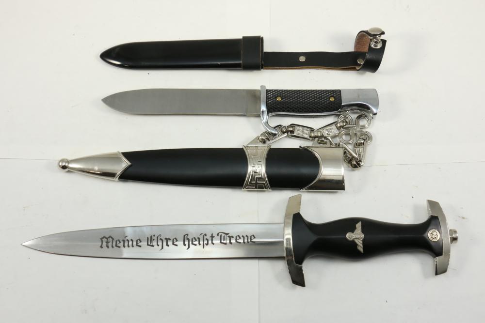 Two reproduction Nazi Germany daggers both in scabbards, one "SS" dagger marked on blade appearing to read "Meine Ehre Heipt Treue"(My Honor Is Loyalty), reverse marked "China" larger measuring 13-7/8", Hitler Youth dagger marked on blade "Blut und Eure!(Blood and Honor!) ricasso marked "RZM 7 Taiwan" measuring 9.5"L without scabbard.