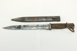Believed to be K98 bayonet in scabbard with single fuller on both sides, no visible markings on bayonet or scabbard, wood handle with press button removed, length of bayonet not incl scabbard 15"L.