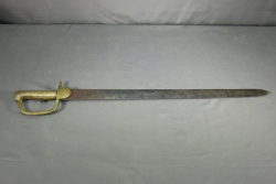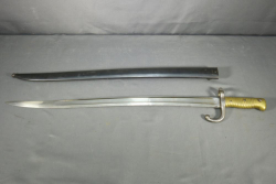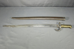 Yataghan sword bayonet for M1866 Chassepot needle-fire rifle, having brass handle, ricasso marked on both sides with single illegible marks, cross guard with hallmarks and serial number R 73713 reverse stamped "15", pommel in front of press stud stamped with single digit "8", spine marked appearing to read "M re Imp ale de Ent" (written section of spine appearing to be partially ground), scabbard having no visible markings however does bear the German style frog stud rather than the French loop, total length of bayonet without scabbard measuring 27.5"L.