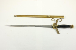 Dagger in scabbard with no makers marks, having eagle cross guard, brass pommel, blade with decorative geometric design, scabbards having applied skull decoration, length of dagger without scabbard measuring 17-1/8"L.