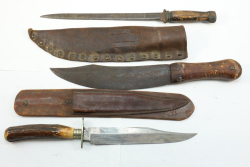 Three knives incl one with stag handle in scabbard, marked on ricasso "E.M.Dickinson Sheffield" reverse marked "The Invicta England", one bolo style with scabbard, marked on blade "W" over "C" (there is what looks like an "A" after the "W"), and one with wire wrap at cross guard point, largest being approx 14"L.