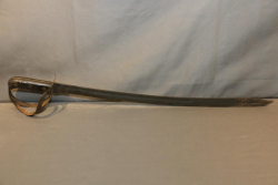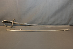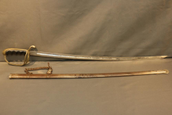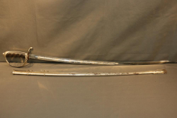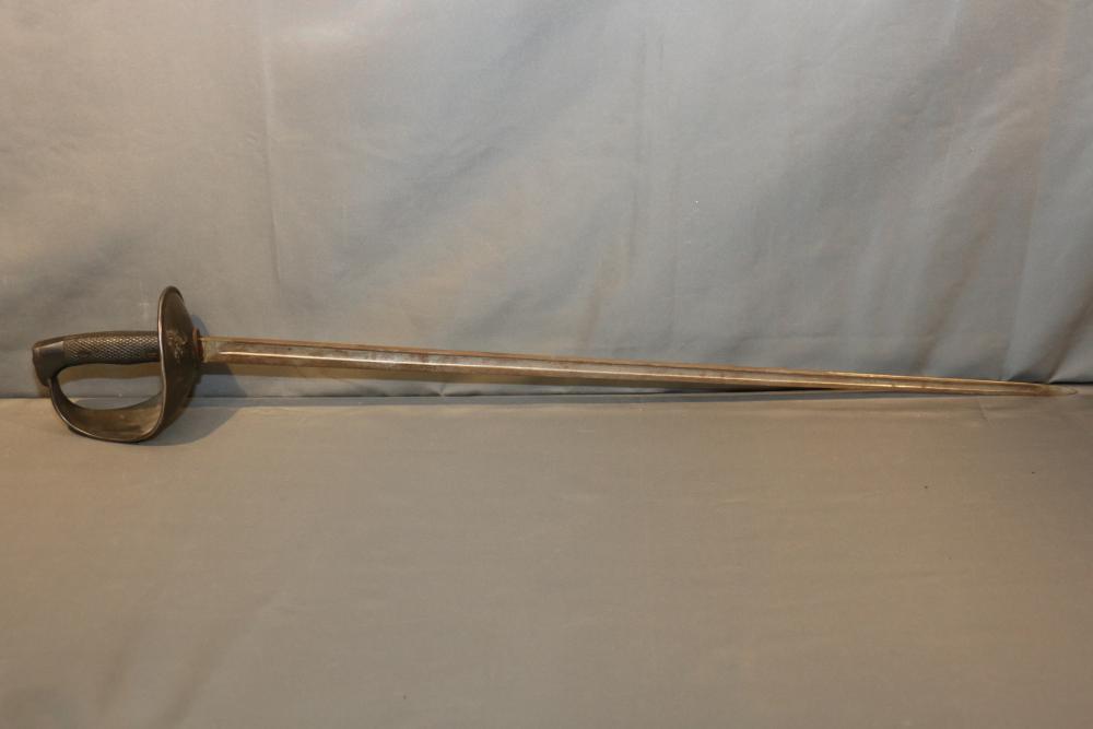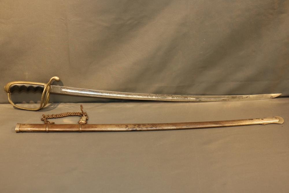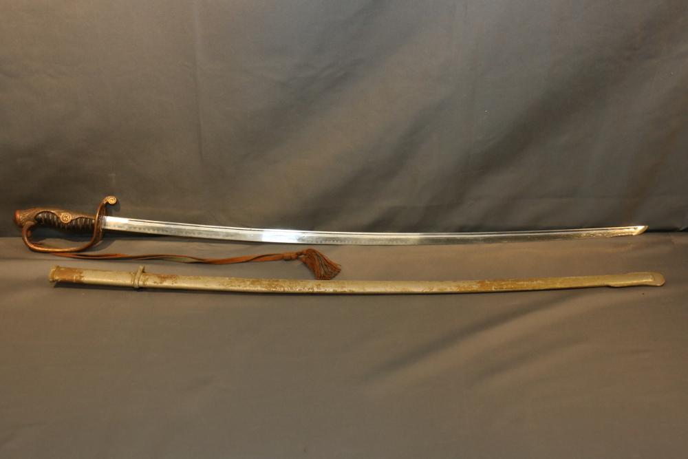 US M1902 Army Officer Saber in scabbard, spine of blade and scabbard both marked "102", ricasso marked "The M.C. Lilly & Co. Columbus, O.", etched blade one side marked "US", plastic grip on wood handle, measurements without scabbard: blade 32"L, guard to pommel 6.25"L, total length 37.5"L.