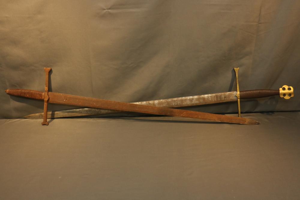 Two Spanish Catholic King's style swords one having motto on blade "Monta Tanto" with reverse marked "Tanto Monta" tight wire wrapped handle with gold wash pommel and cross guard, total length 51.75"L, second having no visible markings missing pommel cross guard is magnetic tight wire wrapped handle, total length 47.75"L.