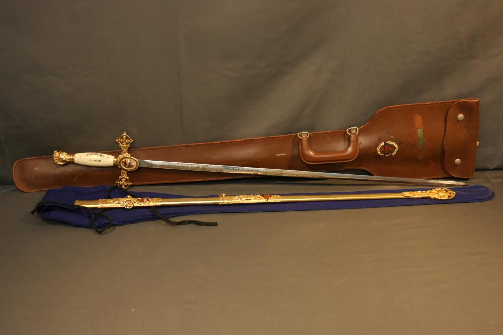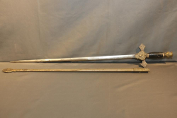 Commemorative sword with etched blade marked "Paul A. Shackleford Jr.", cross guard marked "In Hoc Signo Vinces" (in this sign thou shalt conquer), plastic handle marked "DAS", with knight helmet pommel, length of sword 38.5"L.