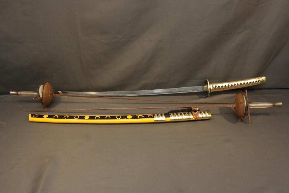 Decorative Samurai sword with wrapped handle, marked on blade "China", and pair of fencing swords with plastic handle, both measuring 42.5"L.