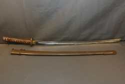 Japanese WWII police sword in scabbard, with wire wrapped wood handle having brass guard with knot, cherry blossom on both sides of guard, single deep fuller running length of blade, measurements without scabbard: blade 33.25"L, guard to pommel 6"L, total length 38.5"L.