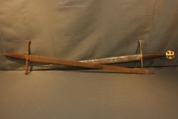 Unidentified short sword having deep fuller, handle with plastic grips, length of blade 24.75"L, guard to pommel 4.75"L, total length 29.5"L.