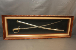 Commemorative Cavalry Officers sword in hanging display case, blade having engraved decoration incl "U.S." and with Star Of David at ricasso, scabbard with decorative engraving, display case measuring 49" X 16.75" X approx 3"T. Pickup only.