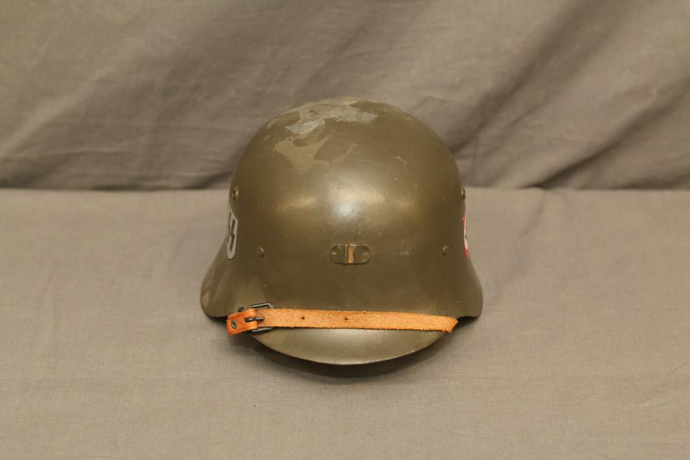 German WWII double decal helmet having swastika on one side and "SS" on other both in shields with helmet liner, and chin strap.